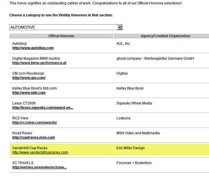 The International Academy of Digital Arts and Sciences announced yesterday that VanderbiltCupRaces.com was chosen as "Official Honorees" in two Webby Award categories; Automotive and Sports.