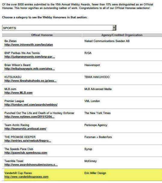 The 12 Webby Honorees chosen by the Academy include; VanderbiltCupRaces.com, MLB.com, the New York Times and Reebok.