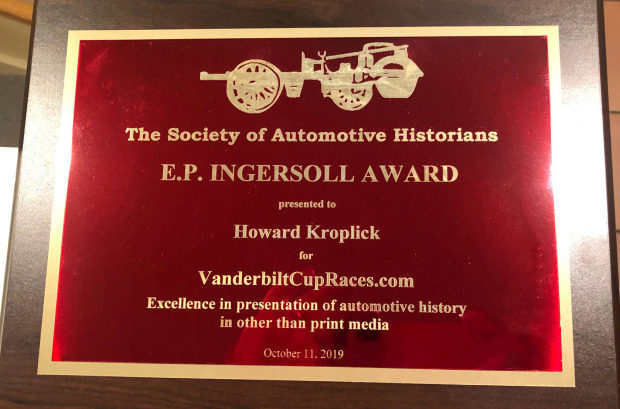 Society for Automotive Historians awarded the website with the E.P. Ingersoll Award for excellence in presentation of automotive history in other than print media. VanderbiltCupRaces.com was only the fifth website honored in the 28-year history of the E.P. Ingersoll Award.