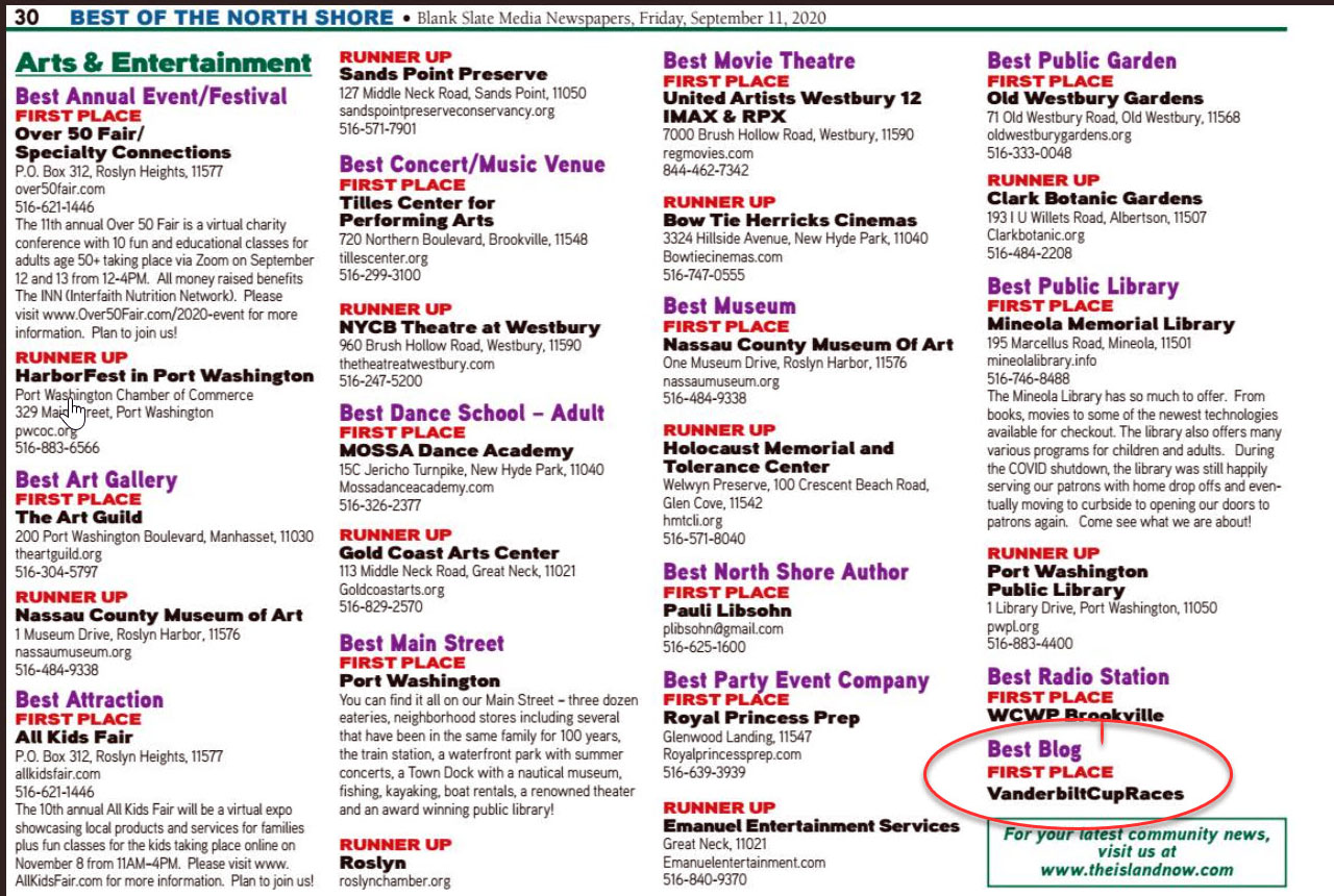 Blank Slate Media, the publisher of Great Neck News, Manhasset Times, NHP Herald Courier, Port Washington Times, Roslyn Times and Williston Times and its website The Island Now, has announced that VanderbiltCupRaces.com was voted by its readers as the 2020 Best Blog on the North Shore.