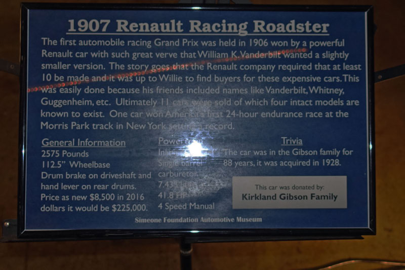 This 1907 Renault Vanderbilt Racer was donted to the Simeone Museum by the Kirlland Gisbson Family in 2016. Only four of the original 11 Renault Vanderbilt Racers are known to exist today.