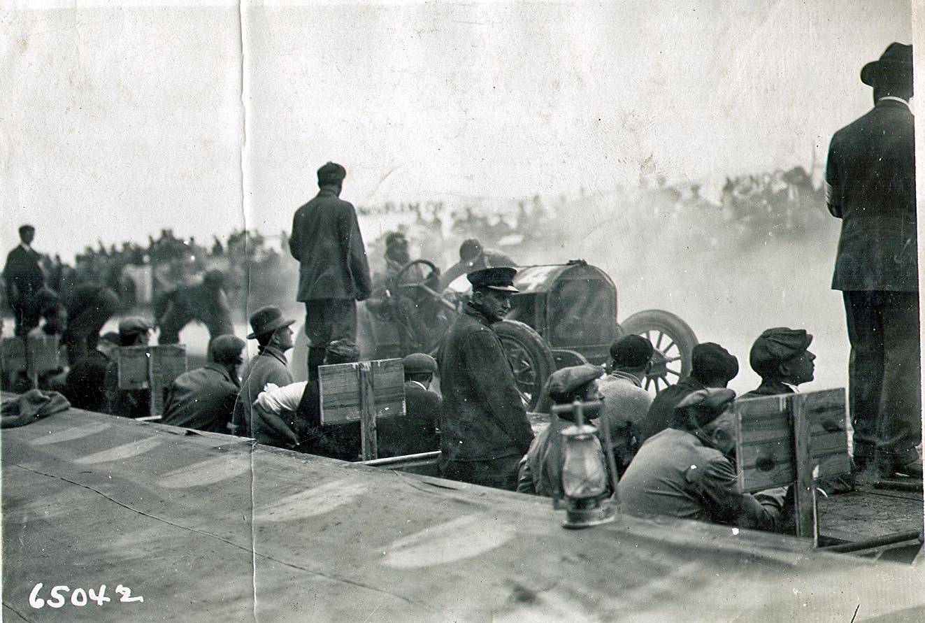 Several photographers shot the 1910 race from the dramatic viewpoint of the crowded pits: