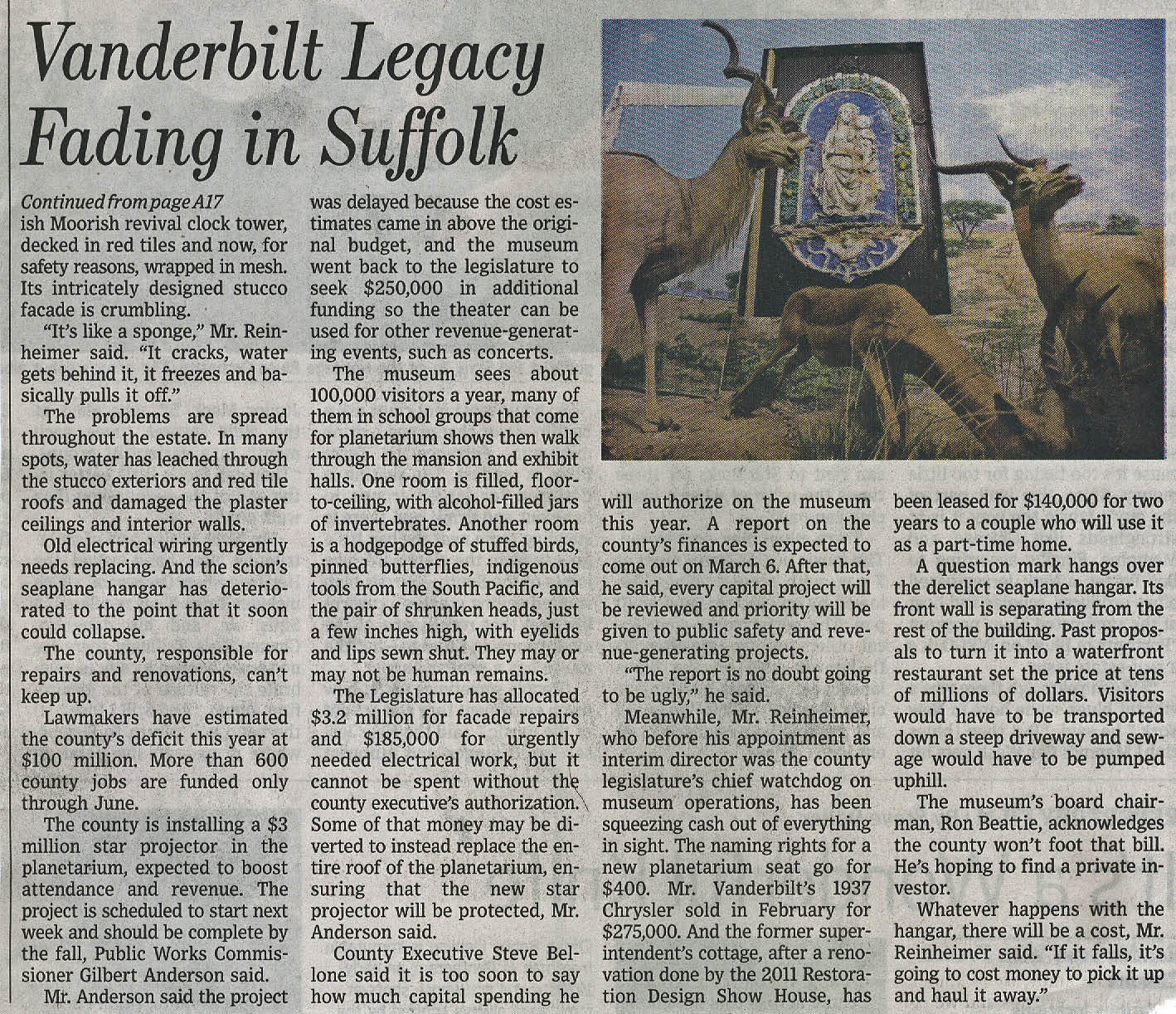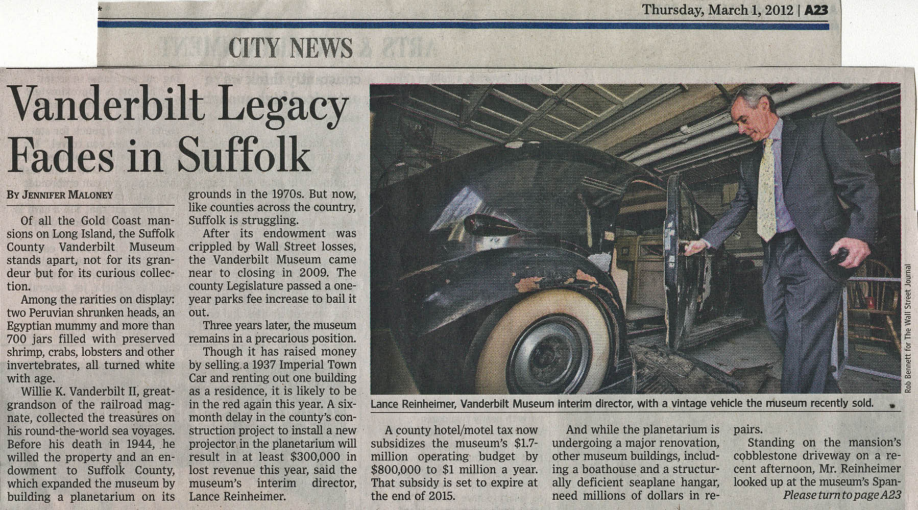 The Wall Street Journal published an article on the Suffolk County Vanderbilt Museum on March 1, 2012 reviewing its current financial status. The article notes the sale of the 1937 Chrysler with this acompanying photo of Vanderbilt Museum Executive Director Lance Rheinheimer with the car.