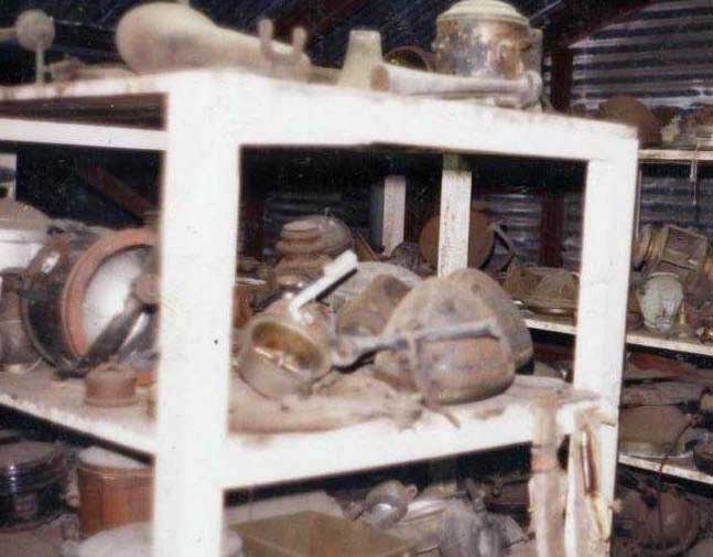 These are photos of the loft above the Long Island Automotive Museum, lots of stuff still there so it must date from the mid to late 1970s and was during one of the (by invite) "Iron Range Days". Note the narrow path to walk down, poor lighting and hundreds of brass side and tail lamps hanging from the ceiling. The shelves held more brass lamps (usually head lamps) horns, all kinds of stuff. There were also rims and lock rings on the floor but not too many as most were out in the truck barn out back.