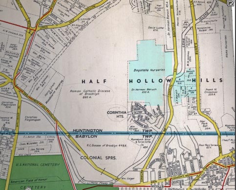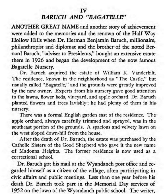Verne Dyson in his 1957, Deer Park Wyandanch Story said that Dr. Herman Baruch purchased “The Castle,” or “Bagetelle” from William K. Vanderbilt. Those of us who grew up in Wyandanch always assumed that the Vanderbilt mansion in Half Hollow Hills was built about the time Vanderbilt built his Long Island Motor Parkway there. We never knew the reason why he created this least understood Long Island Vanderbilt estate. My uncle, James Andrew McGinty, worked at the Bagetelle Nursery in the 1930’s. It should not be too difficult to find the deed of sale from Vanderbilt to Dr. Baruch in the Suffolk County Clerk’s Office in Riverhead. There may well be data on the origins of the mansion in the Huntington Town Building Department records. The Koster Blue Spruce was developed there by Peter Koster, who lived in Wyandanch.