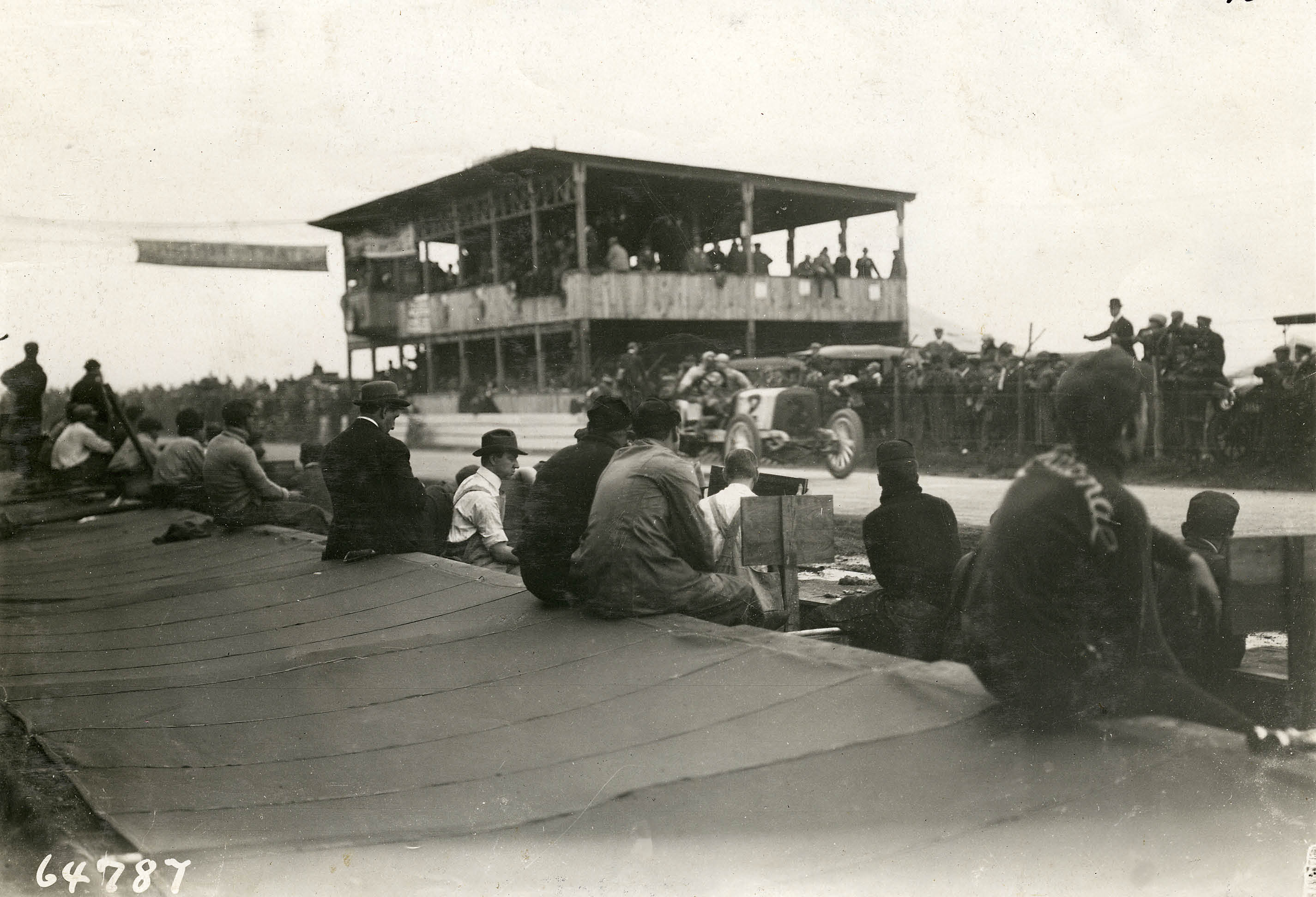 In this photo, driver William Luttgen and his mechanician were refueling their Mercedes during the 1908 Vanderbilt Cup Race in front of the Hempstead Plains (now Levittown) grandstand and the "pits". Note William K. Vanderbilt Jr.standing behind the car carefully observing the car which he owned.