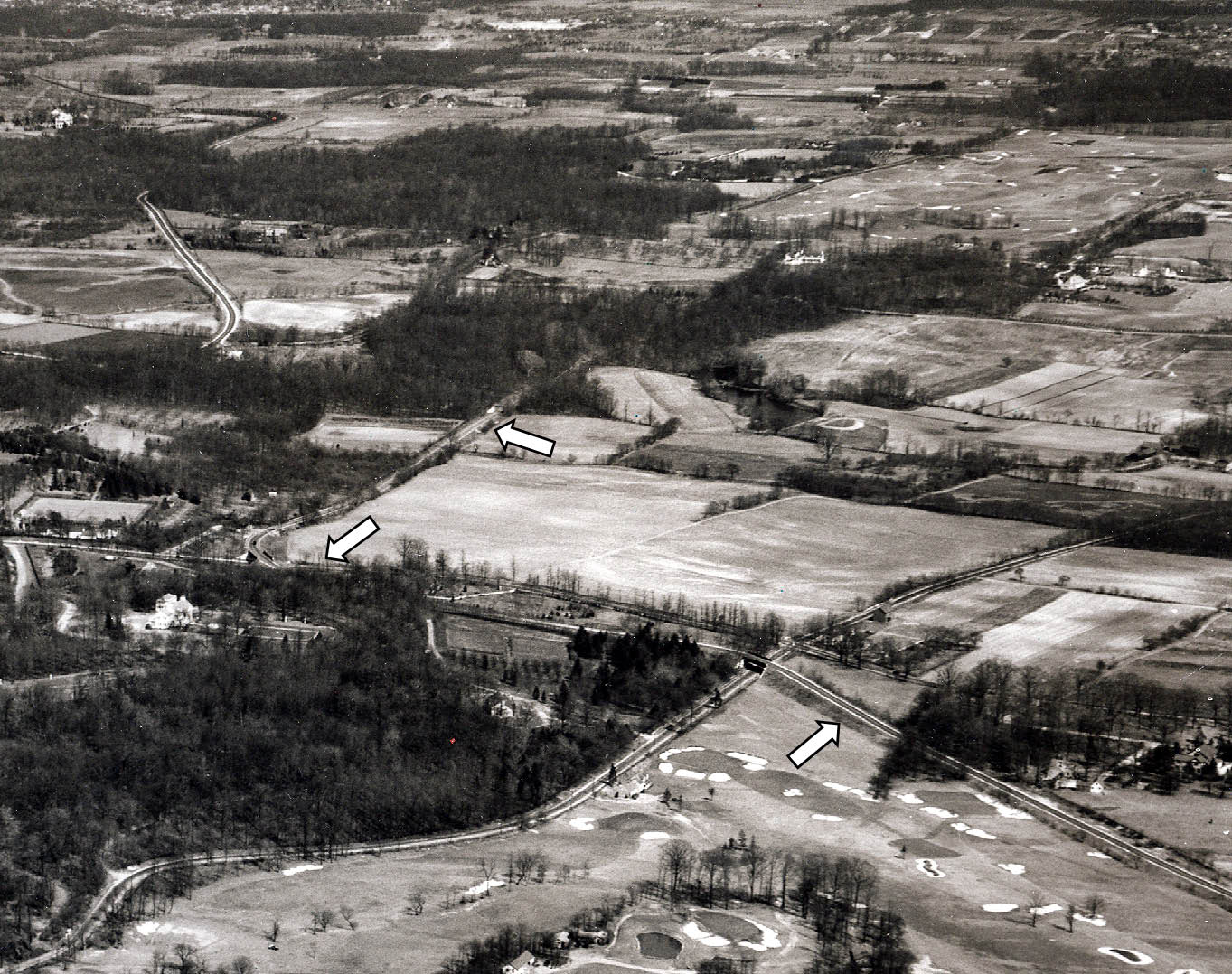 This 1929 aerial of Lake Success, looking northeast, shows the Motor Parkway entering from the right, abutting the Glen Oaks Country Club. It crosses over Marcus Avenue, parallelling Lakeville Road. Note the two Motor Parkway bridges over Marcus Avenue and Lakeville Road.