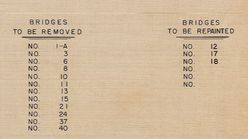 Here's a more informal map from 1939 highlighting who purchased the properties, which bridges were to be removed ("out"), land exchanges (i.e., Levitt) and abandoned sections.