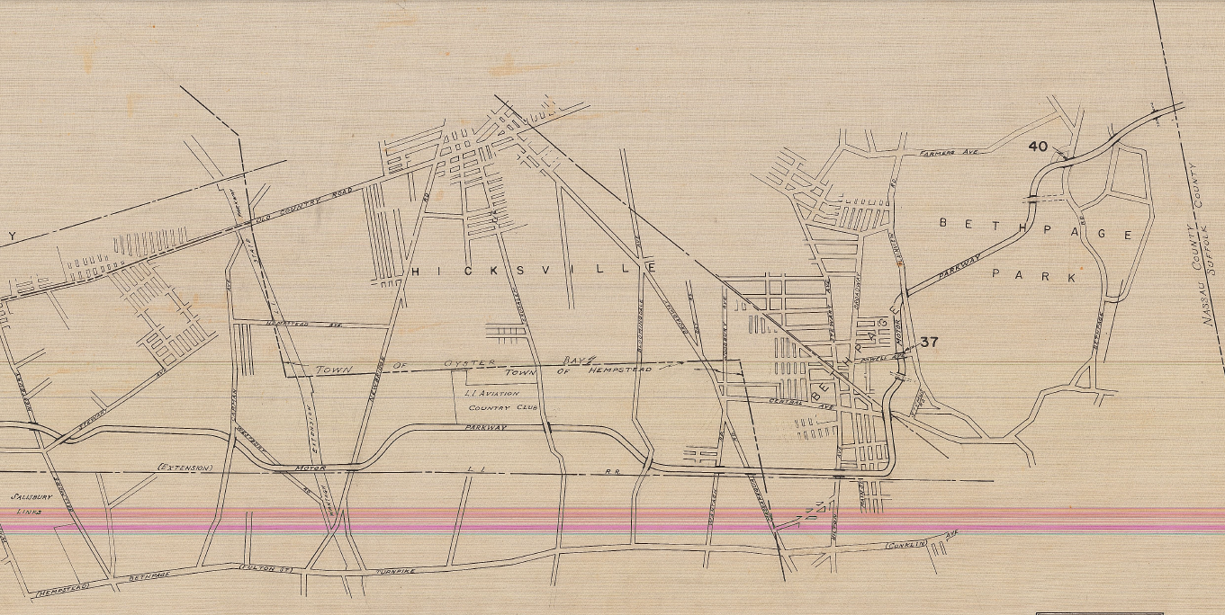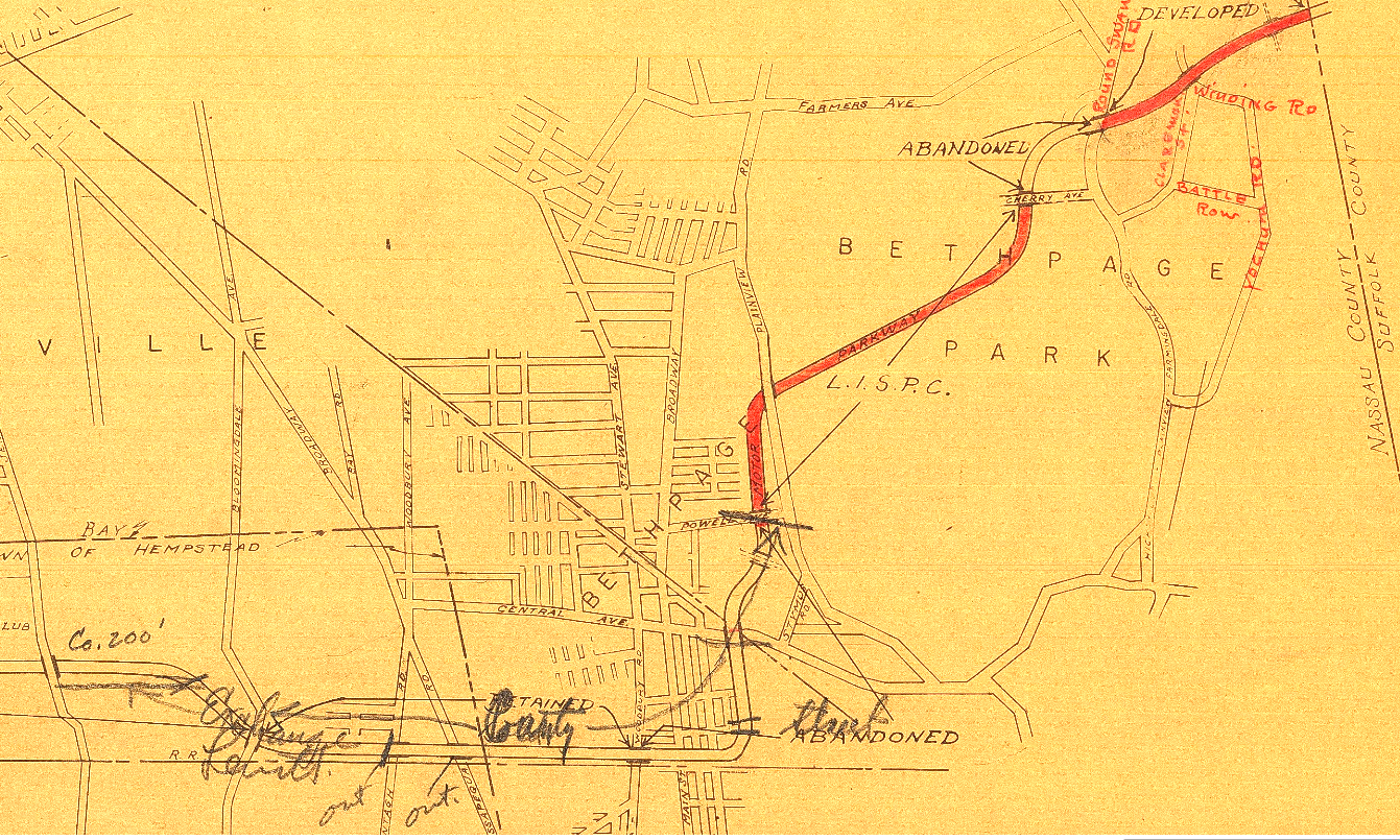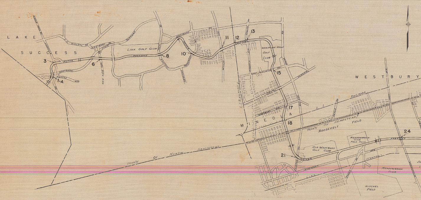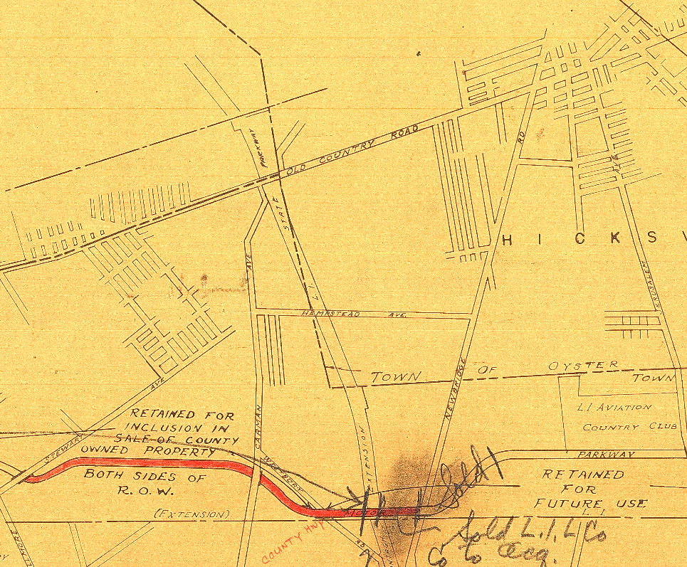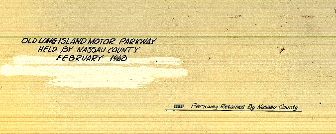 What ever the year, the maps shows Nassau County having possession of much of the Motor Parkway near Roosevelt Field and further west. Over time we know that further development (and the need for tax revenue) probably had decreased the amount of county owned Motor Parkway right of way.