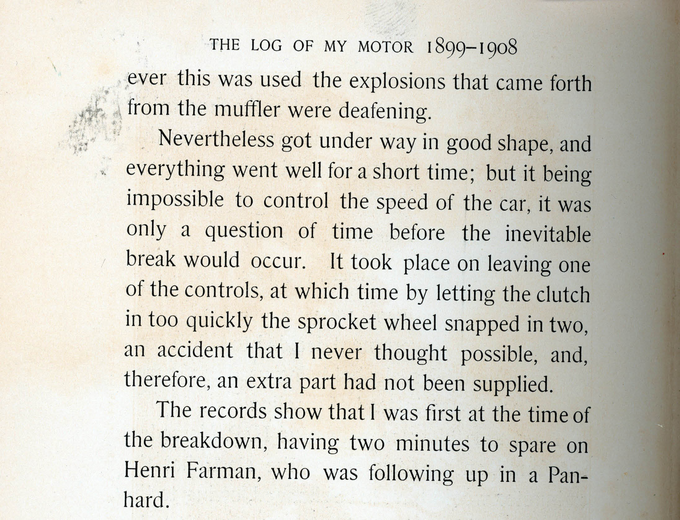 "...everything went well for a short time; but it being impossible to control the speed of the car, it was only a question of time before the inevitable break would occur. It took place on leaving one of the controls, at which time by letting the clutch in too quickly the sprocket wheel snapped in two, an accident that I never thought possible, and, therefore, an extra part had not been supplied...The records show that I was first at the time of the breakdown, having two minutes to spare on Henri Farman (the eventual winner), who was following up in a Panhard."