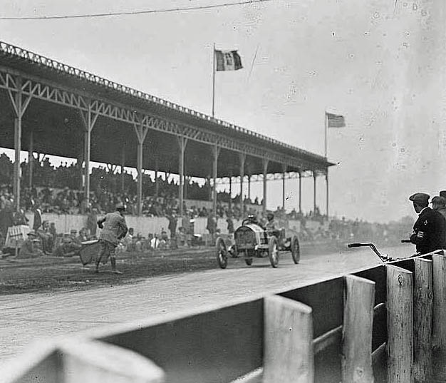In front of the press box/official's stand on the Long Island Motor Parkway. Note the "pits" in front of the grandstand.