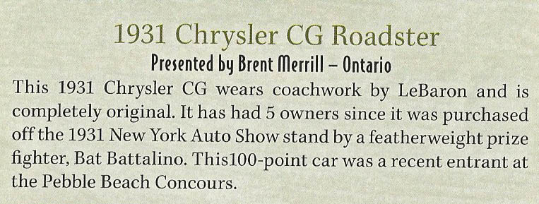 Over 130 vintage and classic cars participated in the concours with Chrysler as the featured make. As noted by co-chairman Tom Jones, the eight cars in the Coach Built "is just going to be insane." Of particular interest will be a luxurious Chrysler Imperial limousine founder Walter Chrysler ordered to be built for his wife.