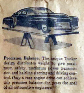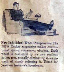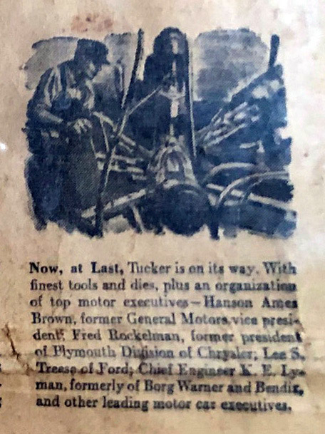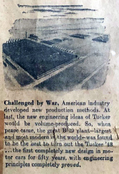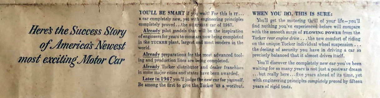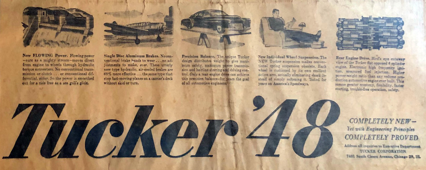 This 1947 newspaper ad was one of the earliest promotions for the Tucker '48.  It highlights the earliest planned features of the automobile.