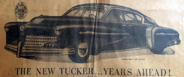 The ad highlighted a stylized artist's rendering of the Tucker'48.