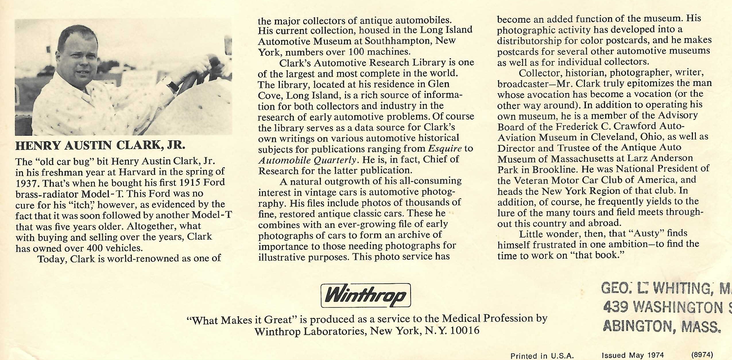 Written by Henry Austin Clark Jr.,this brochure was a handout for Winthrop Laboratories. Found within the Peter Helck archives, entitled 'What makes it great?' was a handout to give to Winthrop executives loosely linking what makes great cars, to great pharmaceutical products.