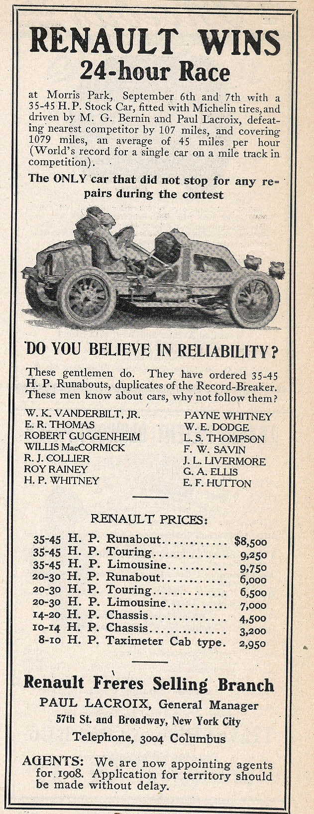 1907 Renault ad promoting the 35-45 HP Runabout with 15 men who ordered them including William K. Vanderbilt, Jr., E.R. Thomas, H.P. Whitney, Payne Whitney and E. F. Hutton.
