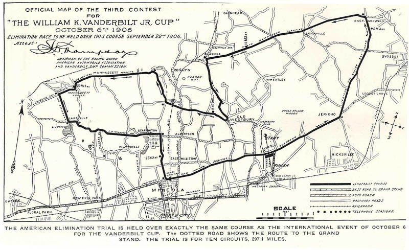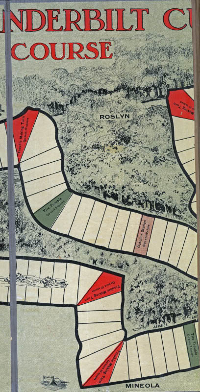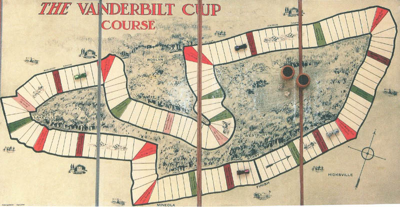 The board reproduced the course for the 1906 Vanderbilt Cup Race, highlighting the villages of Mineola, Hicksville, Old Westbury, Roslyn and Lakeville.