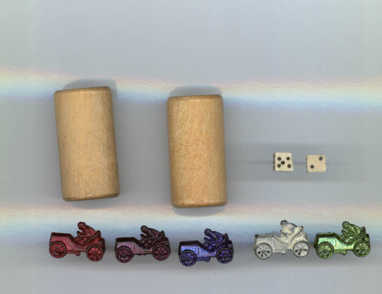 The pieces include five model racers, two dice and two shakers.