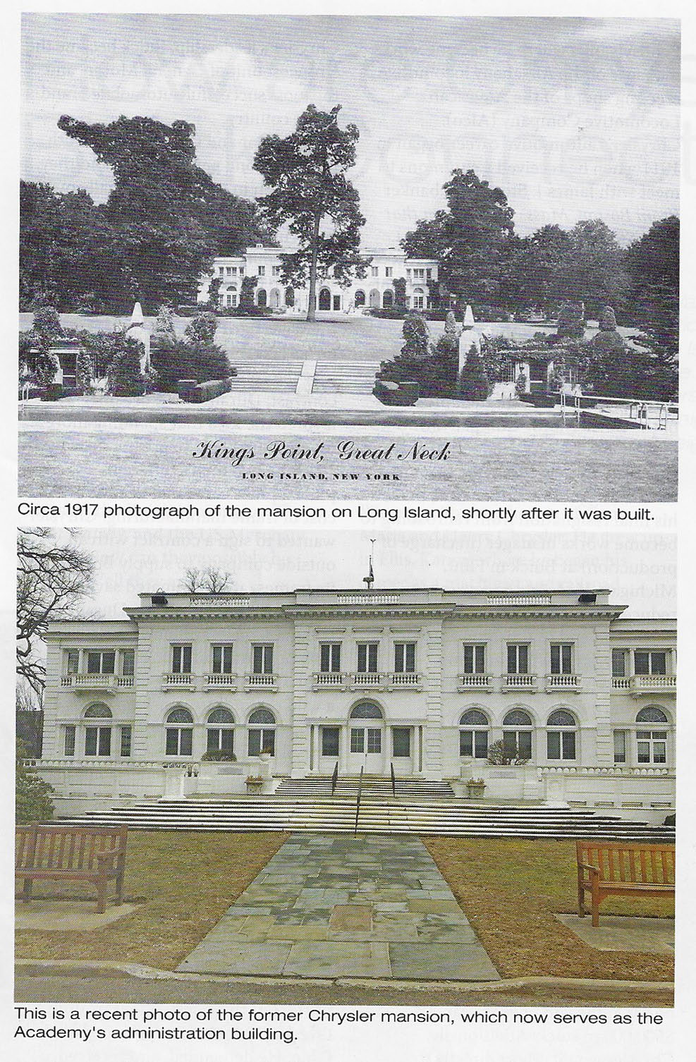 In 1923, for $175,000, Chrysler purchased a twelve-acre waterfront estate at Kings Point on Long Island. The mansion was designed c.1916 by Henry Otis Chapman in the French Renaissance style and built in 1917. The mansion had 23 rooms 10 baths with all the luxury appointments: each bedroom decorated in a different classical style, sunken and formal gardens, outdoor and indoor swimming pools, terraces, paths, and pergolas. It was situated on 450 ft of prime water front frontage with a 150 ft long pier big enough for yachts. From its front windows and terrace you had, and still have, a sweeping magnificent view of western Long Island Sound leading into the East River with the Manhattan skyline in the distance. It is said that the reason Walter Chrysler bought this particular estate was for that view, so he could watch his Chrysler Building rising against the city skyline. Chrysler named it Forker House after his wife’s family name.