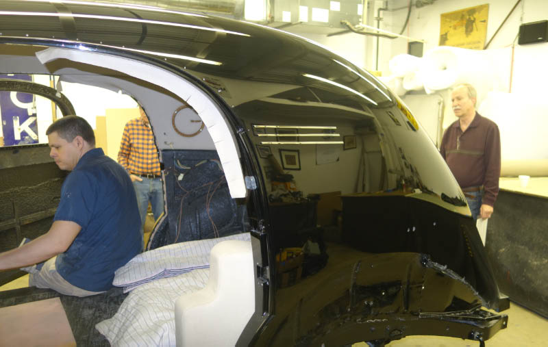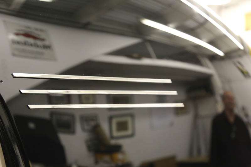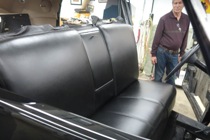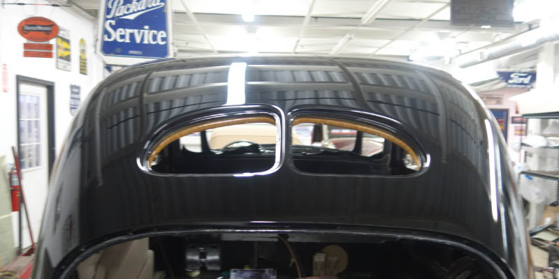 Mike of Automotive Restorations sits on the floor of the rear compartment, note the plated speed lines that are at eye level on the outside of the body have been reinstalled. These had to go on before the new headliner was installed.