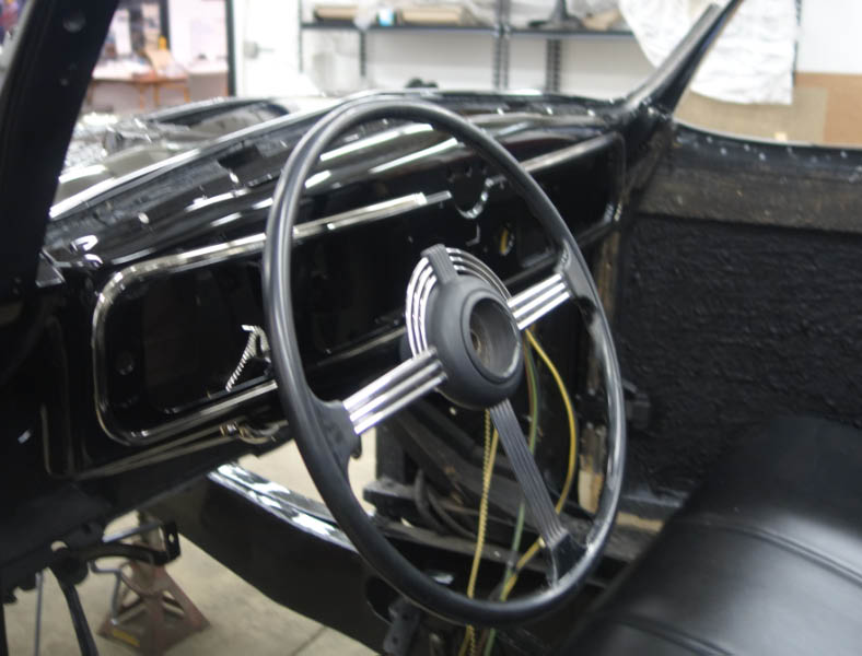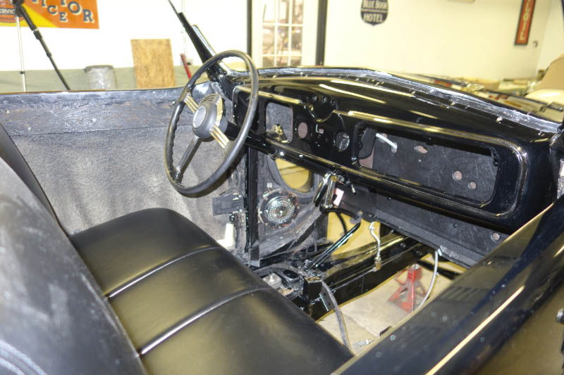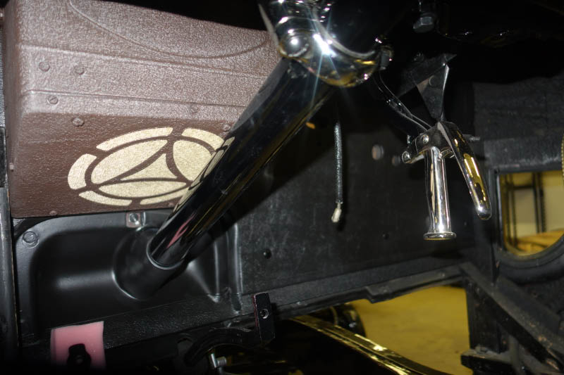 A view of under the dash board - note the speaker box for the radio tucked in above the steering column and the plated (chrome) emergency brake handle. The firewall pad that was restored /recreated is now in place as well.