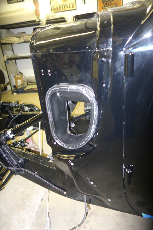 The reinstalled restored rear axle can be seen here. Note the chassis ends, yet the body continues on well past (nearly 1 foot) the end of the frame. Remember the body is all framed out of ash wood so that extended tail of the body is all wood with a sheet metal covering. All four doors have been re-hung.