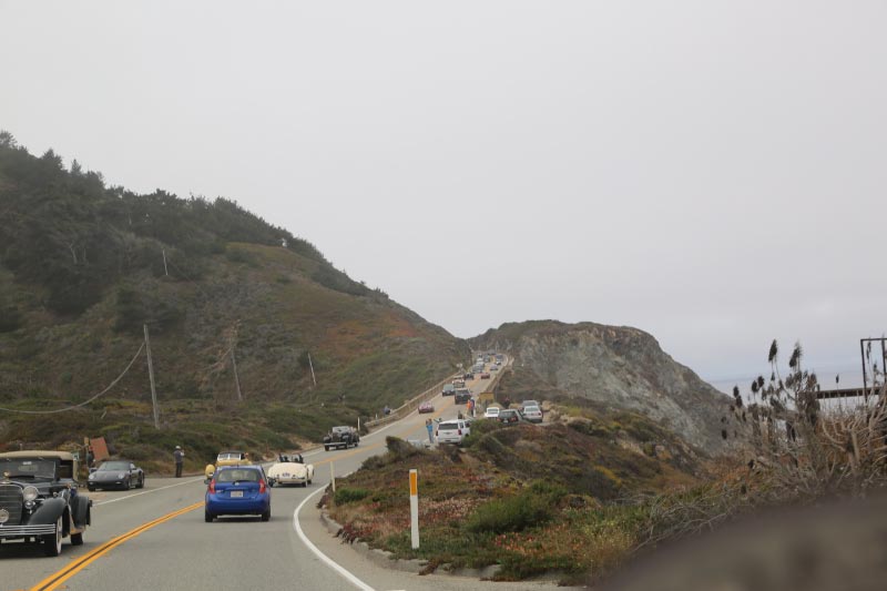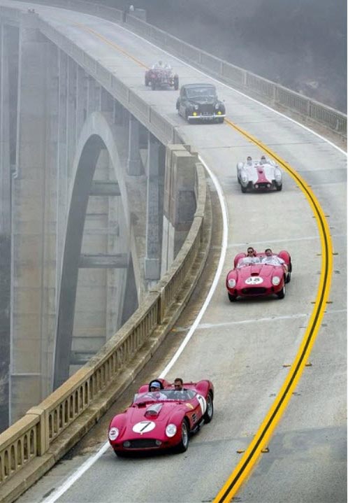 When the cars leave Carmel Valley and hit Highway 1, the coastal road that stretches 655-miles from the redwoods of Leggett in northern California to Dana Point, just below Los Angeles in the south, the Tour also takes on a splendour befitting a film set. The section of road between Carmel-by-the-Sea and Big Sur is designated a national scenic byway, winding and hugging the cliffs, and passing various coastal parks. Built between 1919 and 1937, this segment crosses several historic bridges, including Bixby Creek Bridge, a reinforced concrete arch with a 320-foot (98-m) span, and the Rocky Creek Bridge.