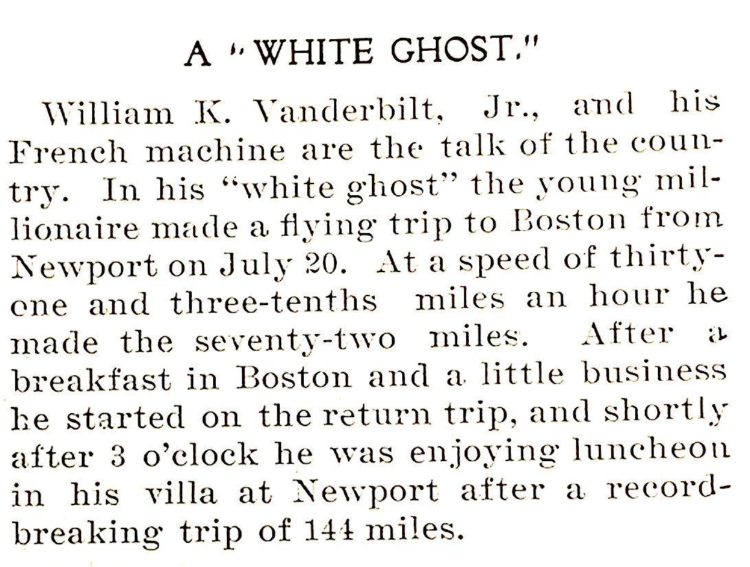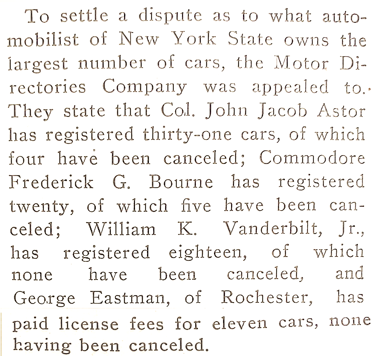 While Willie K. had 18 registered cars in New York, he ranked behind John Jacob Astor and Frederick G. Bourne in terms of the most cars registered. However, not counting those cancelled he would be #2. (The Automobile Aug., 1906)