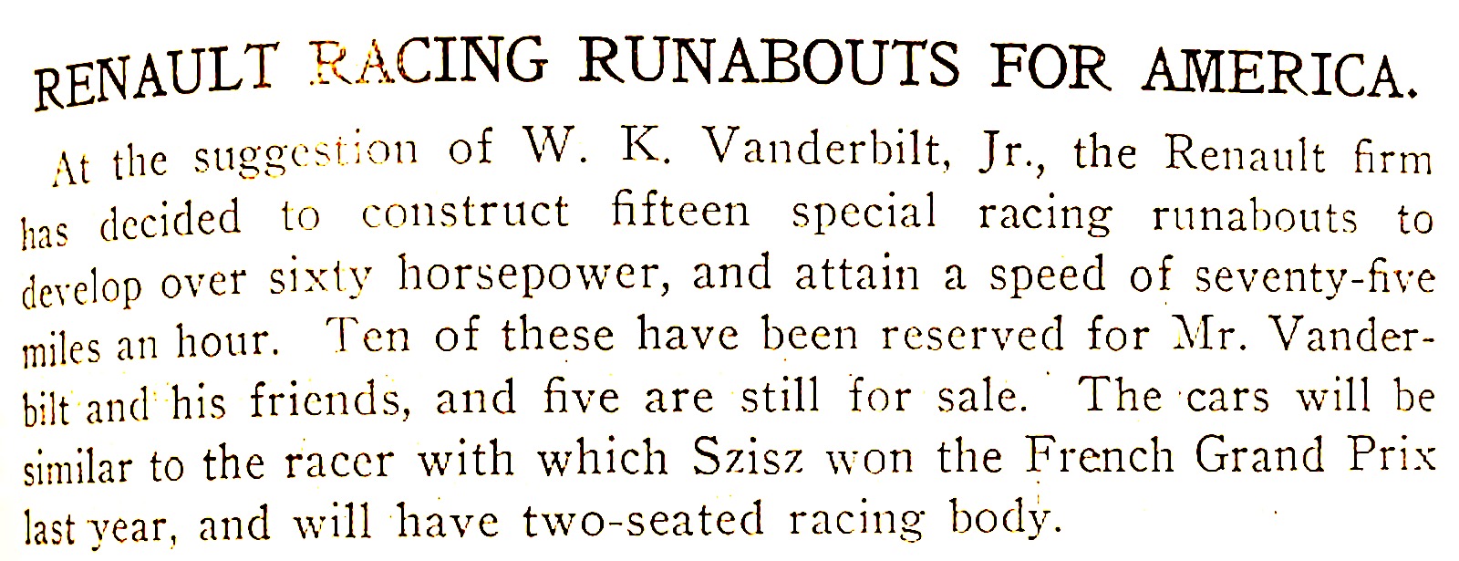 Willie K. wants 10 special racing Renault Runabouts for himself and his friends. (The Automobile Apr. 25, 1907)