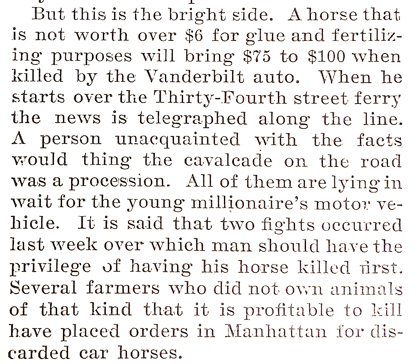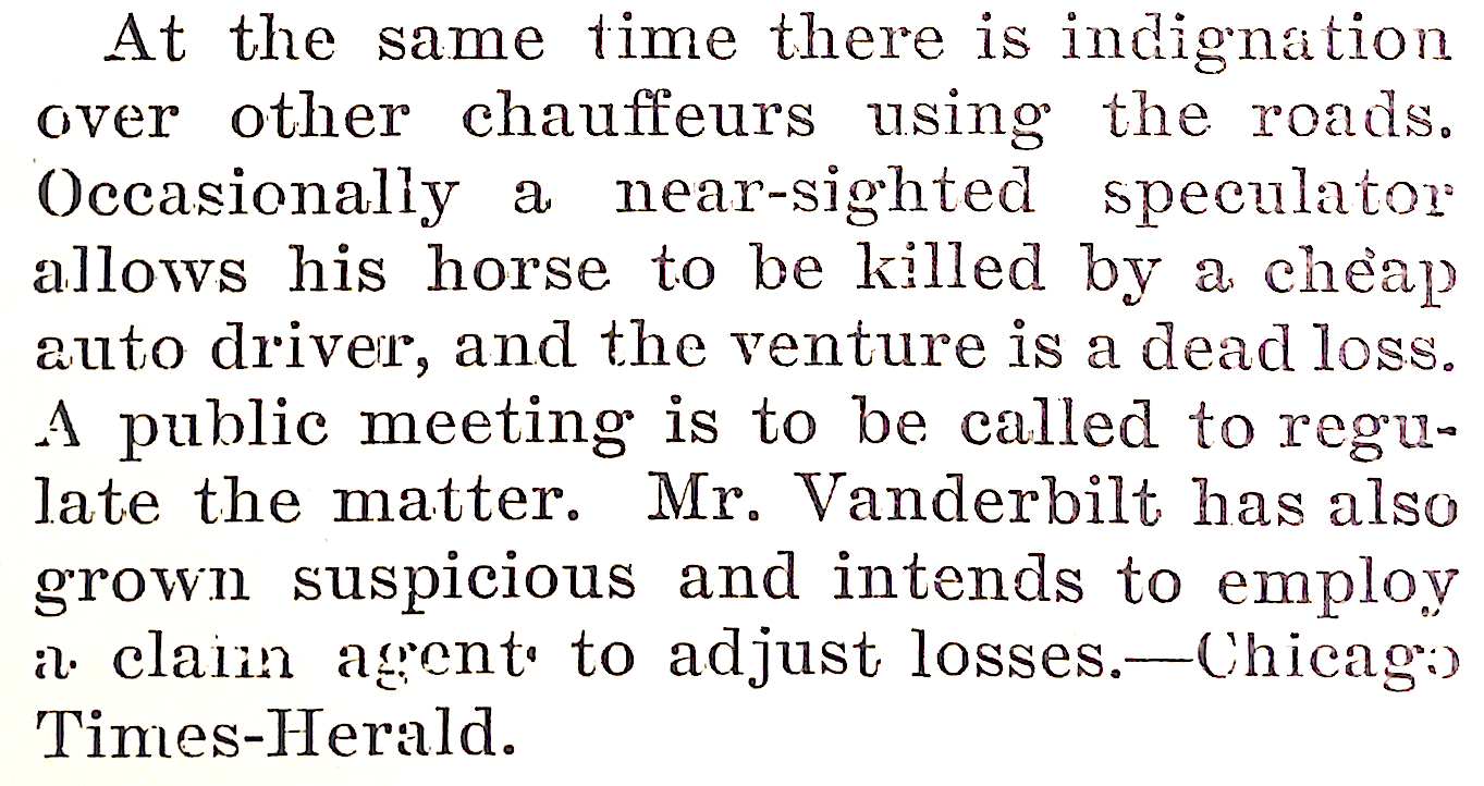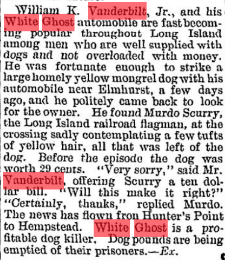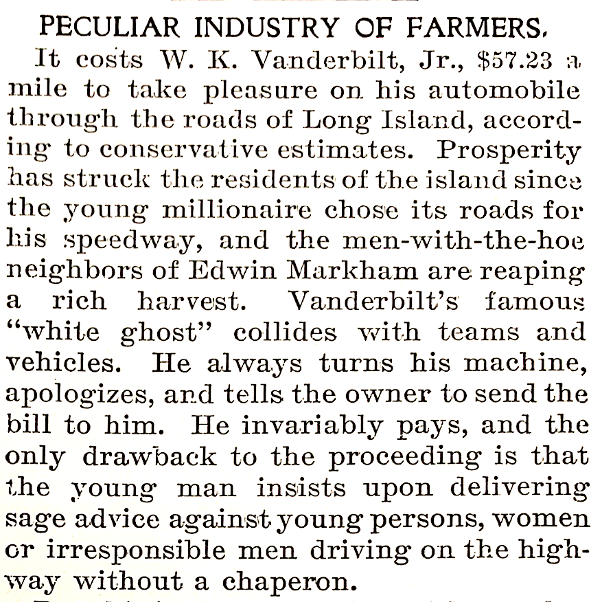 The first day of the century had this item about Willie K. speeding along the roads of Long Island in his "White Ghost". Farmers and pet owners saw an opportunity to make some money in a rather unorthodox way. (The Autobain Jan. 1, 1900)