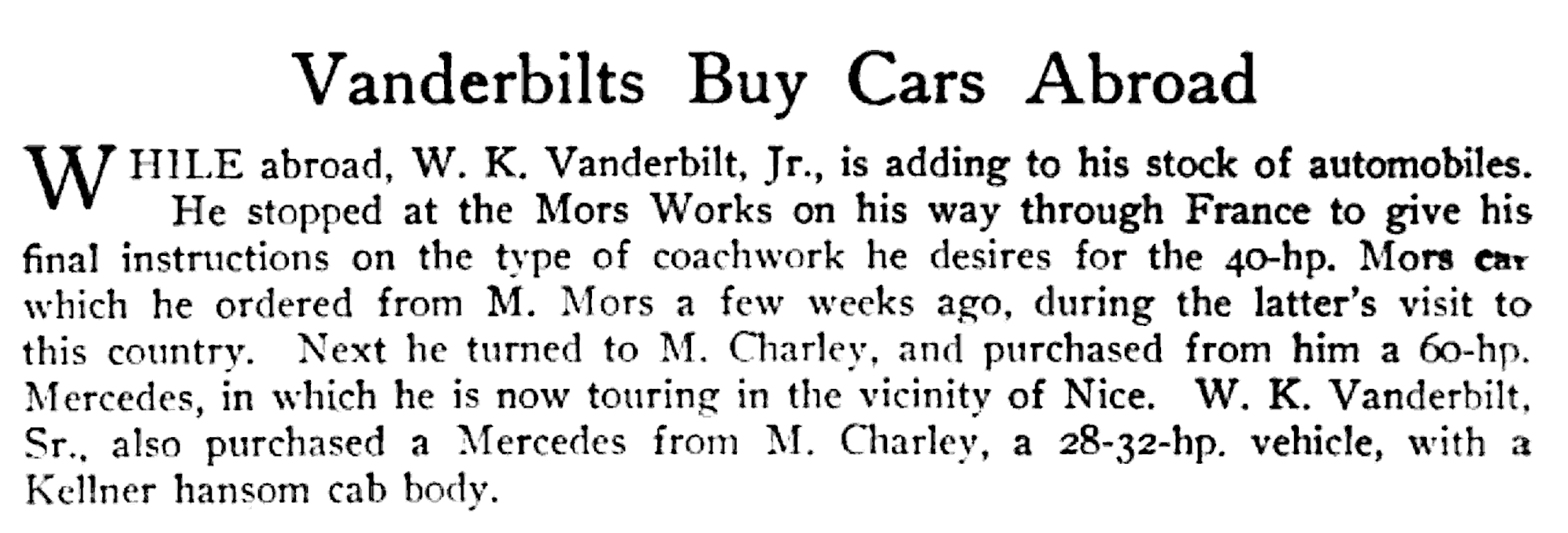 A new Mors and Mercendes for Willie K. in 1905. (Automobile Topics Mar. 18, 1905)