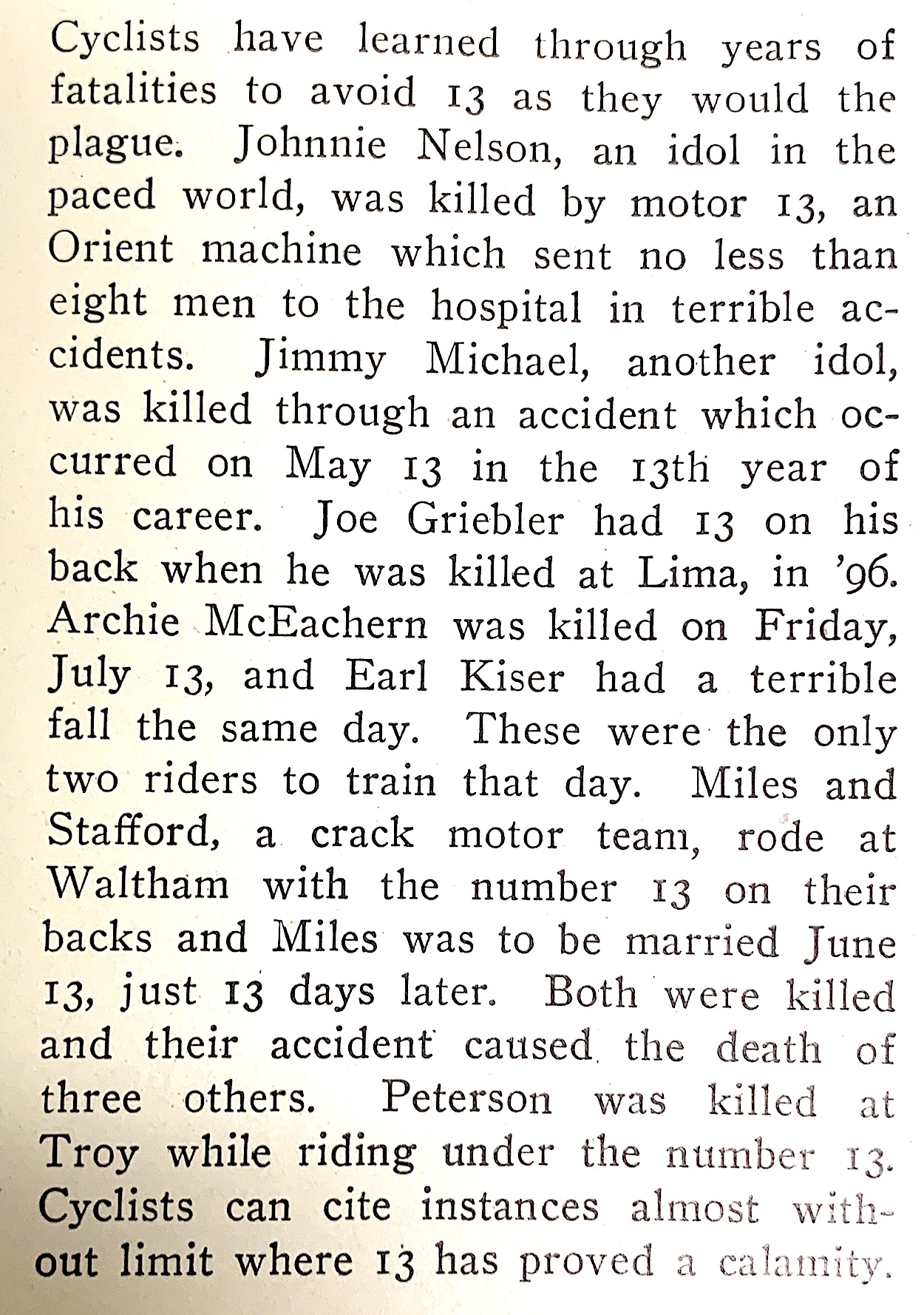 Numerous accidents were associated with #13 and caused apprehension among bicyclists also.