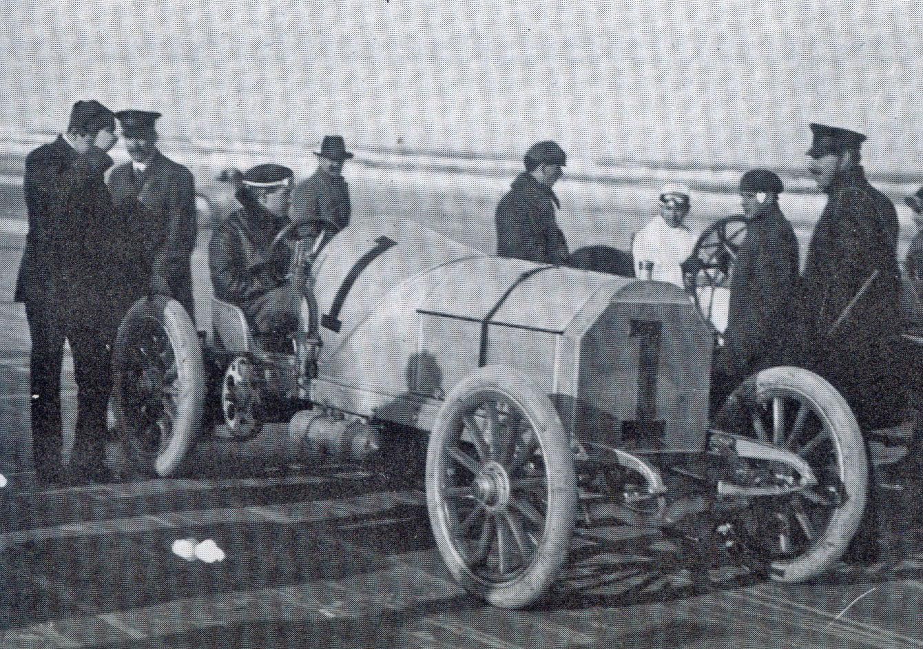 In the first heat for the Sir Thomas Dewar Trophy at the Ormond-Daytona Beach races held on January 24,1905, Vanderbilt in his #1 90-HP Mercedes (second right) competed against the #6 Mercedes driven by Edward Hawley (far left), the #5 Napier driven by Arthur McDonald (third from right) and the #4 Stanley Steamer driven by Louis Ross. In a surprise, the 20-HP steamer won the heat and then went on to win the final race for the Dewar Trophy.