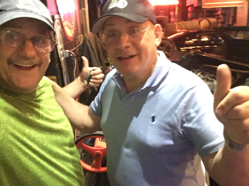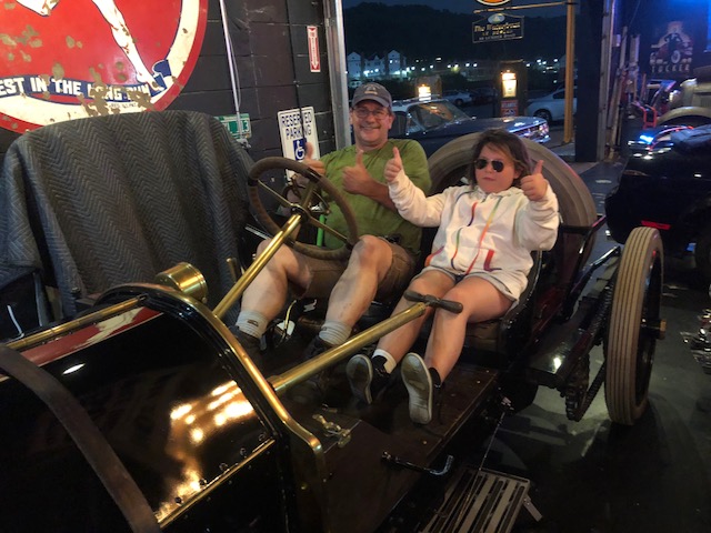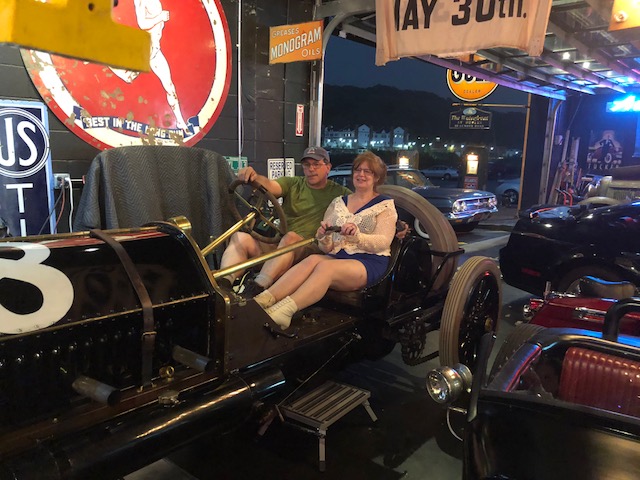 i just love the fact that my great grandfather was part of two victories in the Vanderbilt Cup Races of 1909 ( which this “Alco” car is the 1909 model) and 1910. Carolyn is holding a brass pump which supplied the fuel to the car. Special thanks to Howard Kroplick for opening his shop for us in no time at all so i could see a car that I’ve only heard of or seen pictures for 54 years. It was an honor i will never forget.