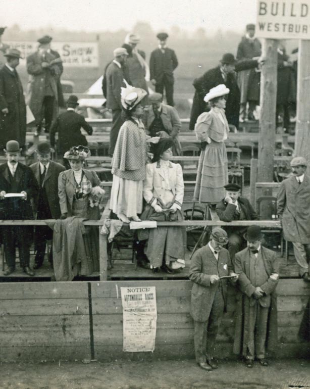 Willie K’s mother, Alva (second from left), and his step-father, O. H. P. Belmont (third from left) watched the race from their front-row box seats of the 1906 Vanderbilt Cup Race grandstand. Alva Vanderbilt Belmont was a regular attendee at her son’s races and always attracted visitors to her box seats just in front of the course.