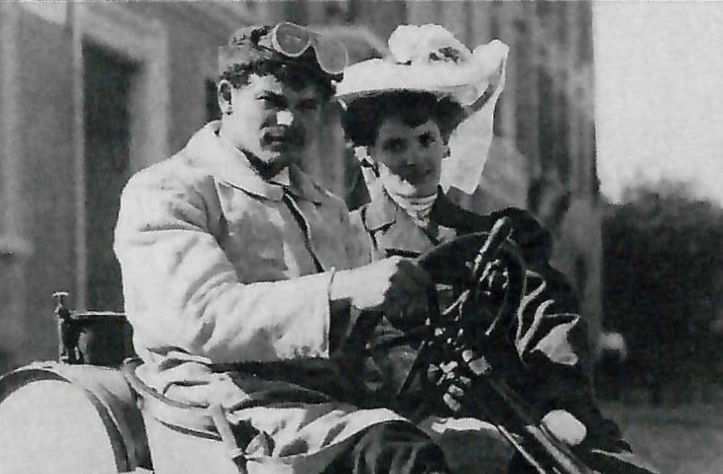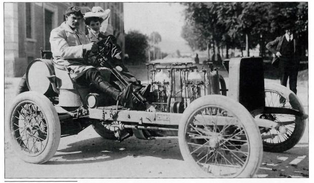 The 80hp #18 Darracq with Victor Hemery at the wheel. The woman in the passenger seat is Marie Louise Laurent. It is unknown what her relationship to Hemery is.