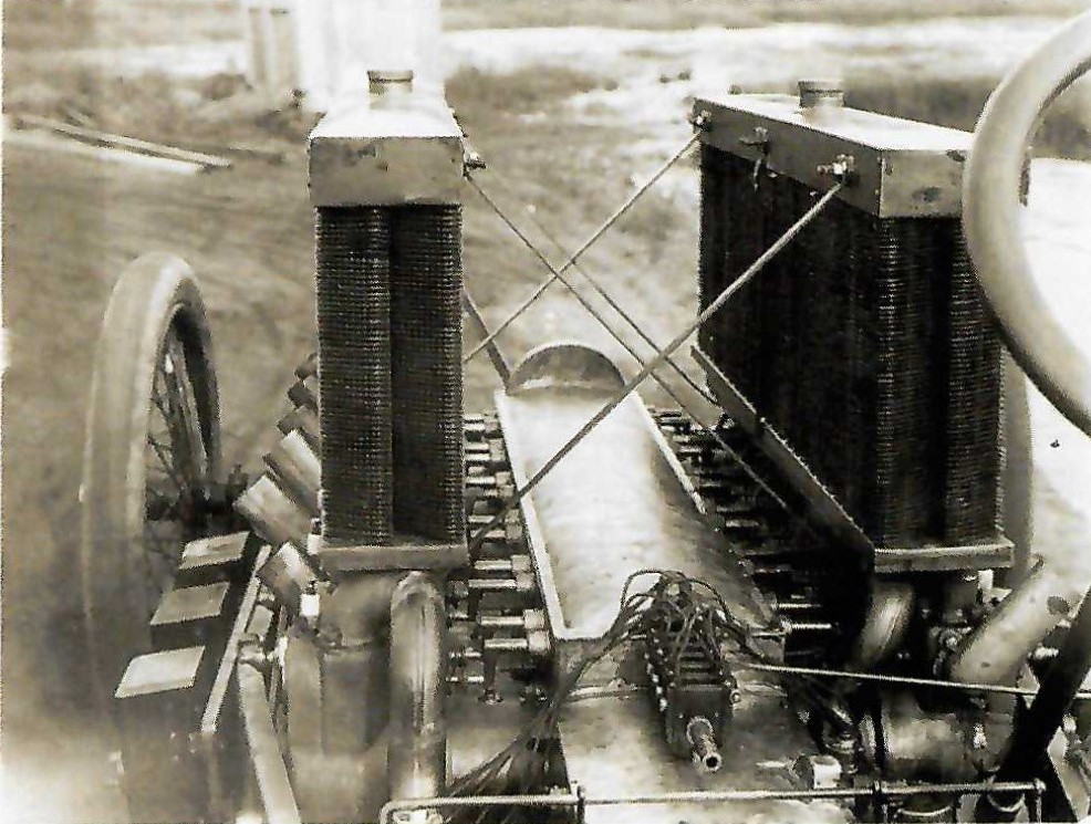 Based on his small, 20hp, twin-cylinder horizontal engine, he linked together 6 of them to produce one of the largest engines of the day to do battle in the Vanderbilt Cup.