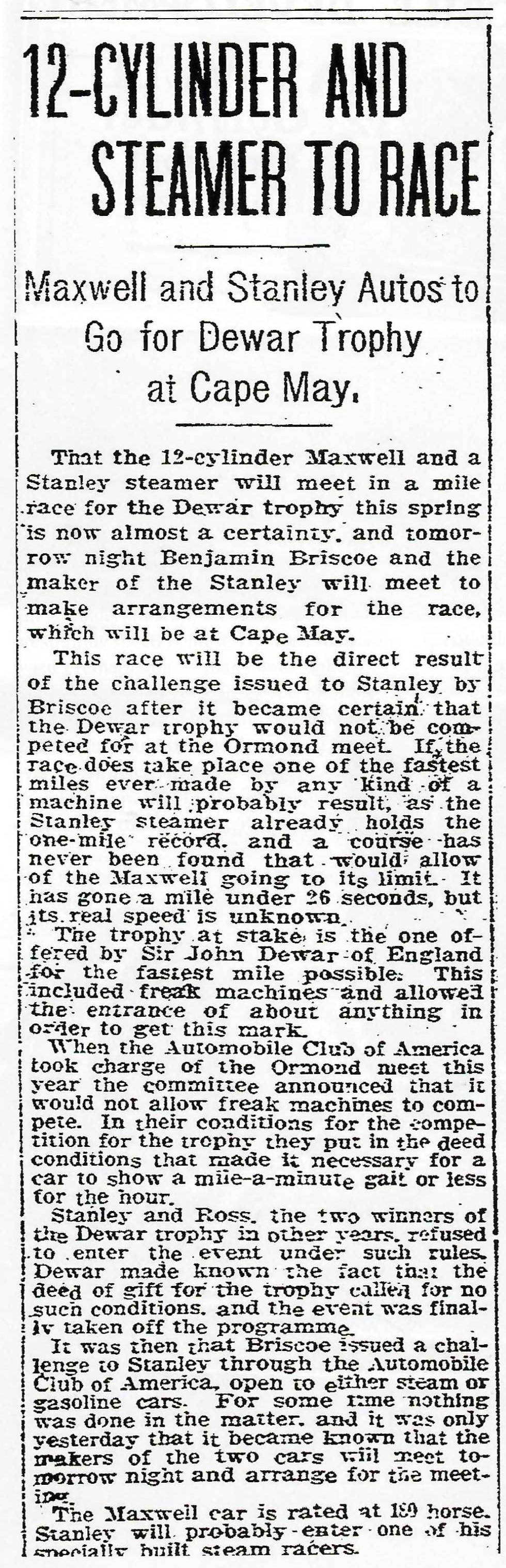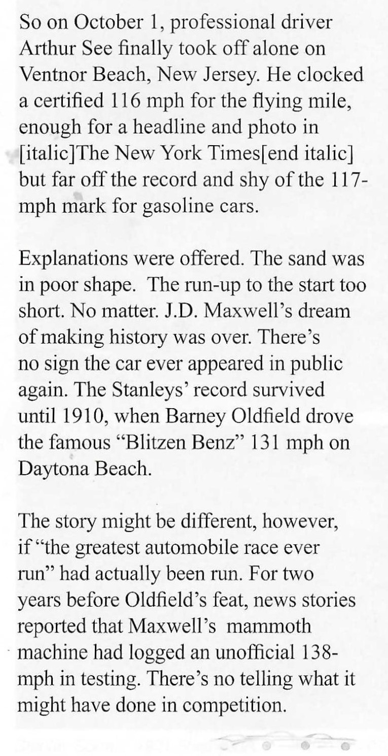 It wasn't until October 1, 1907, that professional driver, Aurthur See took the 12-cylinder Maxwell to Ventnor Beach, New Jersey to certify a speed and time, but fell short of any records. The 12-cylinder Maxwell was never heard from again.