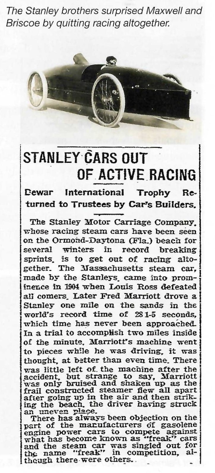 Eventually, a race between the Stanley Brothers' steam race car, 'Rocket' was planned, but Rocket was demolished in another race and subsequently, the Stanley brothers left racing for good.