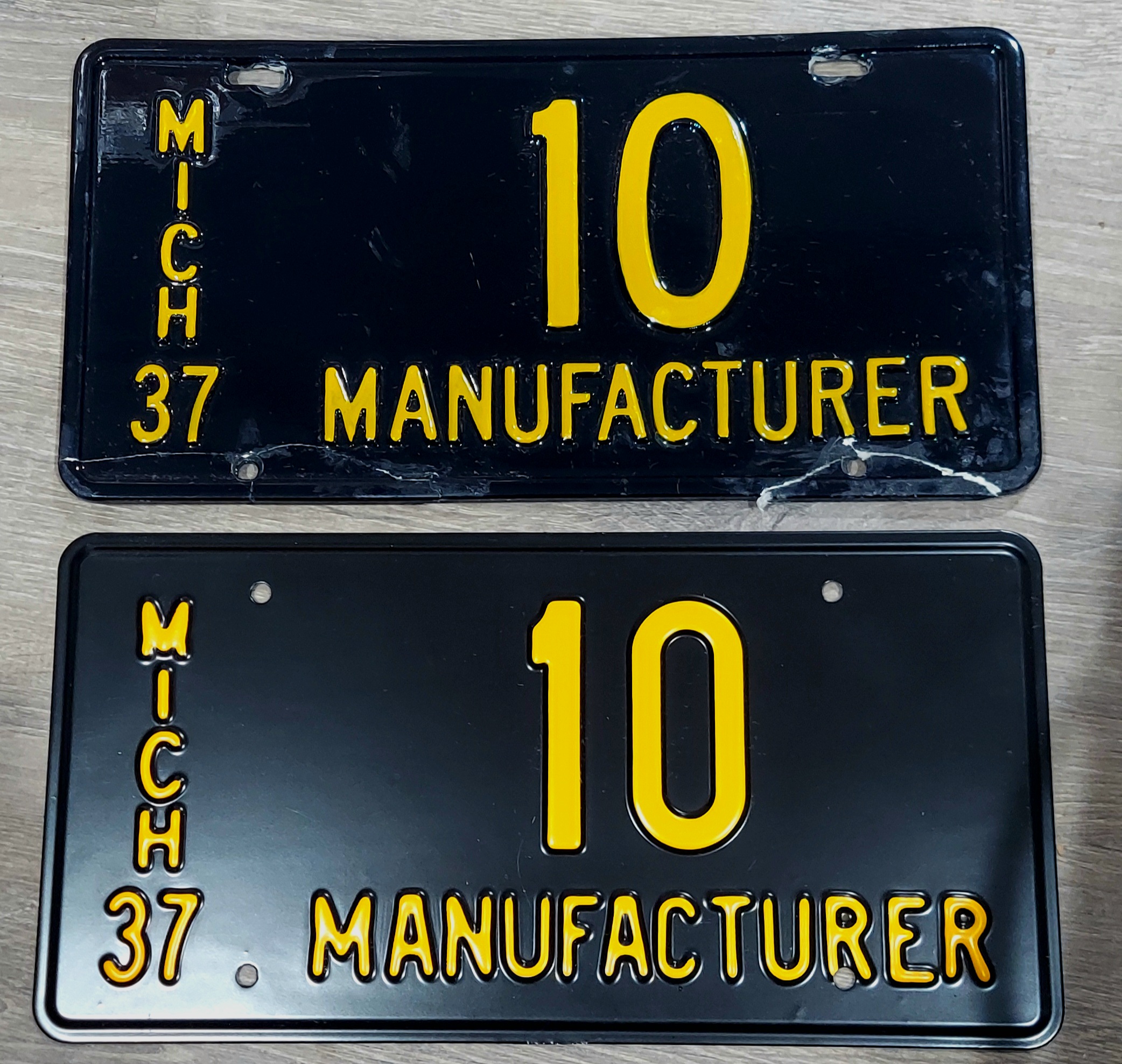 Taking a week of research on Michigan plates from the 1930's and close examination of the 1937 photos, licenseplates.tv felt they had a more accurate plate and corrected fonts for the Chrysler. Old plastic plates (top) new stamped metal plates (bottom)