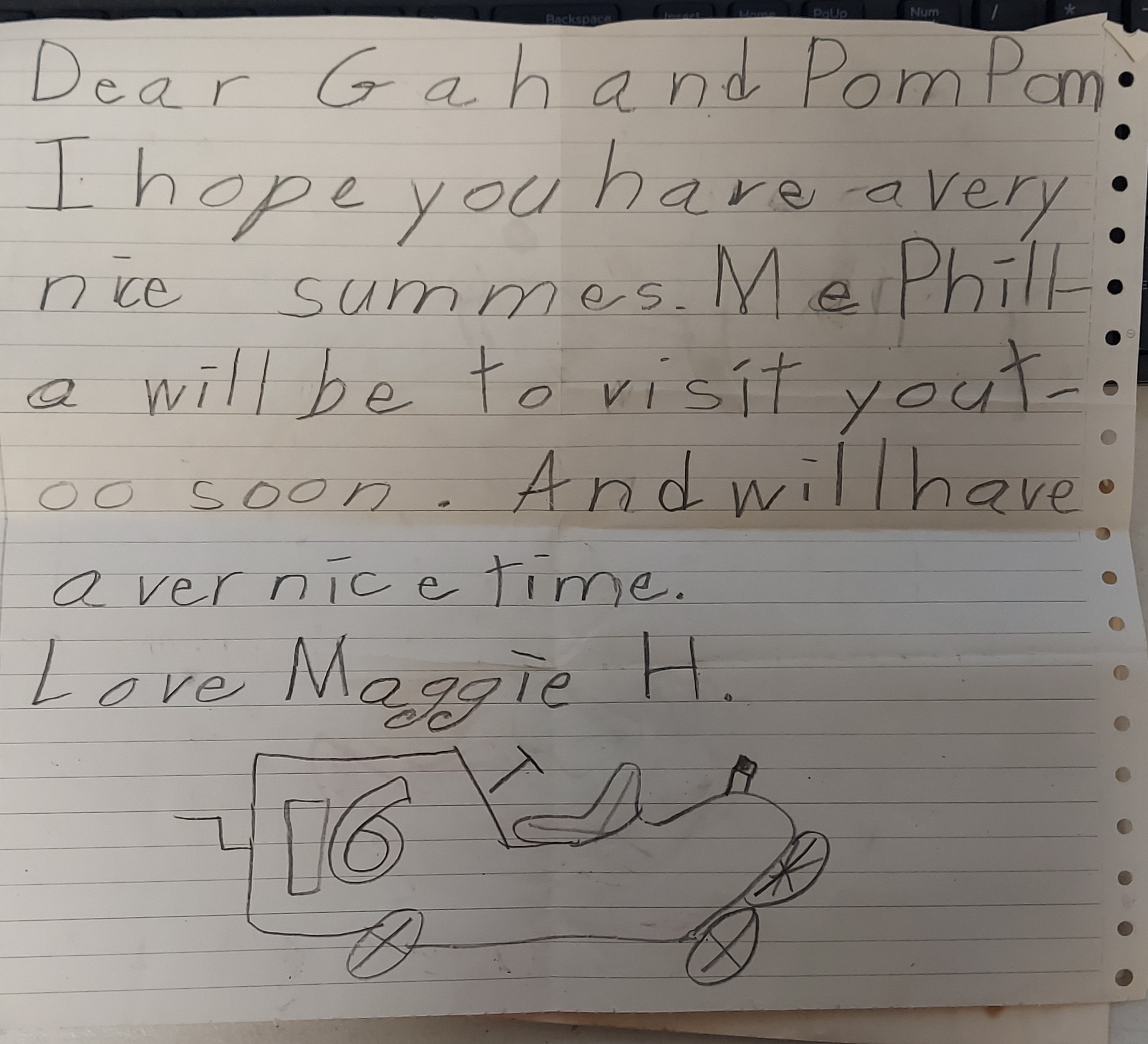 Her cute letter to her grandfather and grandmother was punctuated by her wonderful drawing of Old 16.
