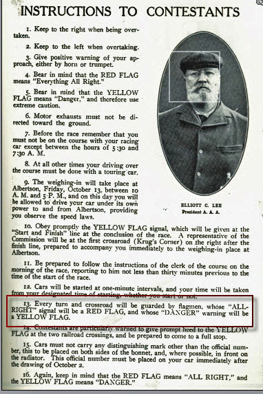 "Every turn and crossroad will be guarded by flagmen, whose 'ALL-RIGHT' signal will be a 'RED FLAG' and whose 'DANGER' warning will be a 'YELLOW_FLAG'"