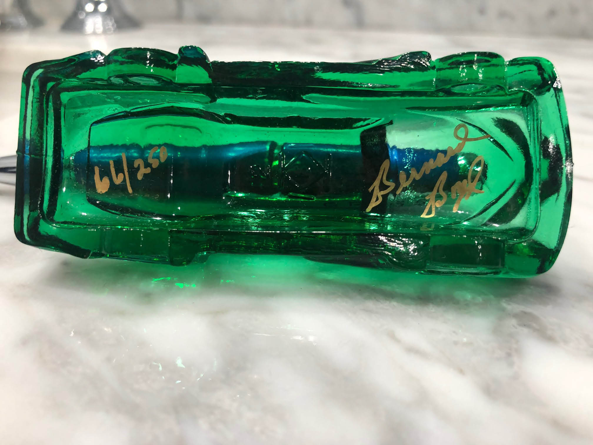 After a mould was fashioned from a metal model, the first glass Tucker rolled out of the kiln on August 28, 1989, in Windsor Blue. Over the next five years, a total of thirty different colors were released. Due to demand, the “retired” Tucker was reintroduced in seven additional colors. With its increased popularity, Boyd’s decided to create a second series; this group boasts thirty additional colors. Some of the colors were noted to be slag (streaked or swirled appearance), Vaseline (able to glow yellow to green under UV black light), and iridescent (“Carnival”) varieties, a testimony to the glassmaking expertise of Boyd’s. On July 1, 2013, the last Tucker was produced in Mocha. Perhaps more would have been released, but the factory closed the following year.