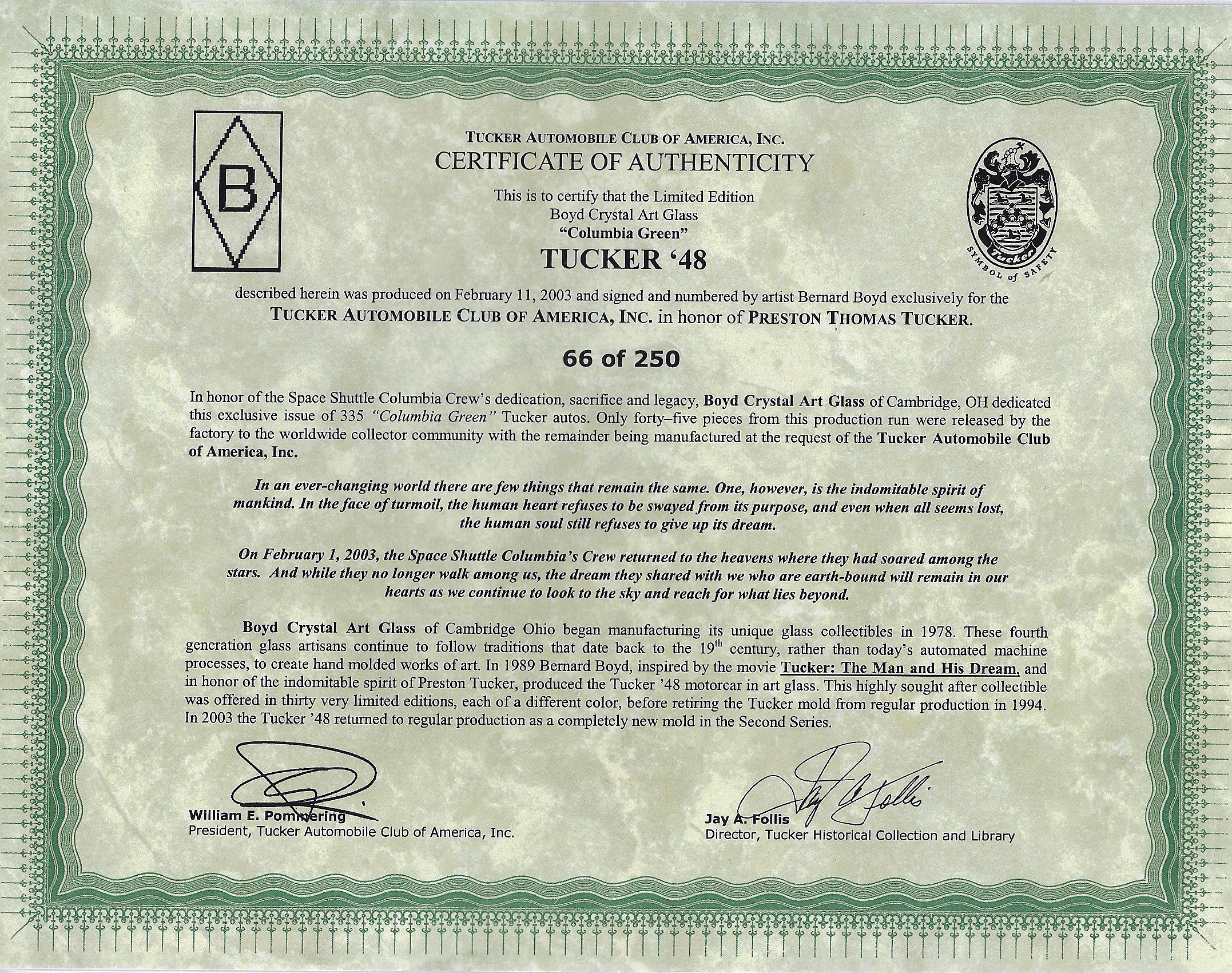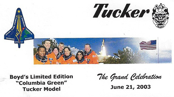 The Tuckers were not only available through Boyd’s and dealers, but they were also promoted in Tucker Tribune, the official blog of the Tucker Automobile Club of America, Inc. TACA members shared information, and possibly were privy to some of the specialized releases. For example, the Columbia Green Tucker was produced as a limited edition to pay homage to those killed in the Space Shuttle Columbia Disaster. Other models were available with hand-painted details, “satinized” with a frosted finish, or signed by Bernard F. himself.