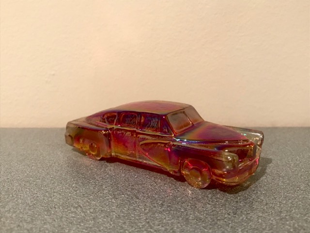 As Boyd’s Crystal Art Glass, Inc., facilities were upgraded, new moulds were added, an array of colors was introduced, and an identifying “B in Diamond” mark was modified every five years. From people visiting the factory’s adjacent store, the Boyds realized that there was a demand for figurines that might appeal more to boys and men. After Bernard F. successfully introduced a train engine and its cars, a customer who owned a Tucker suggested this unique automobile.