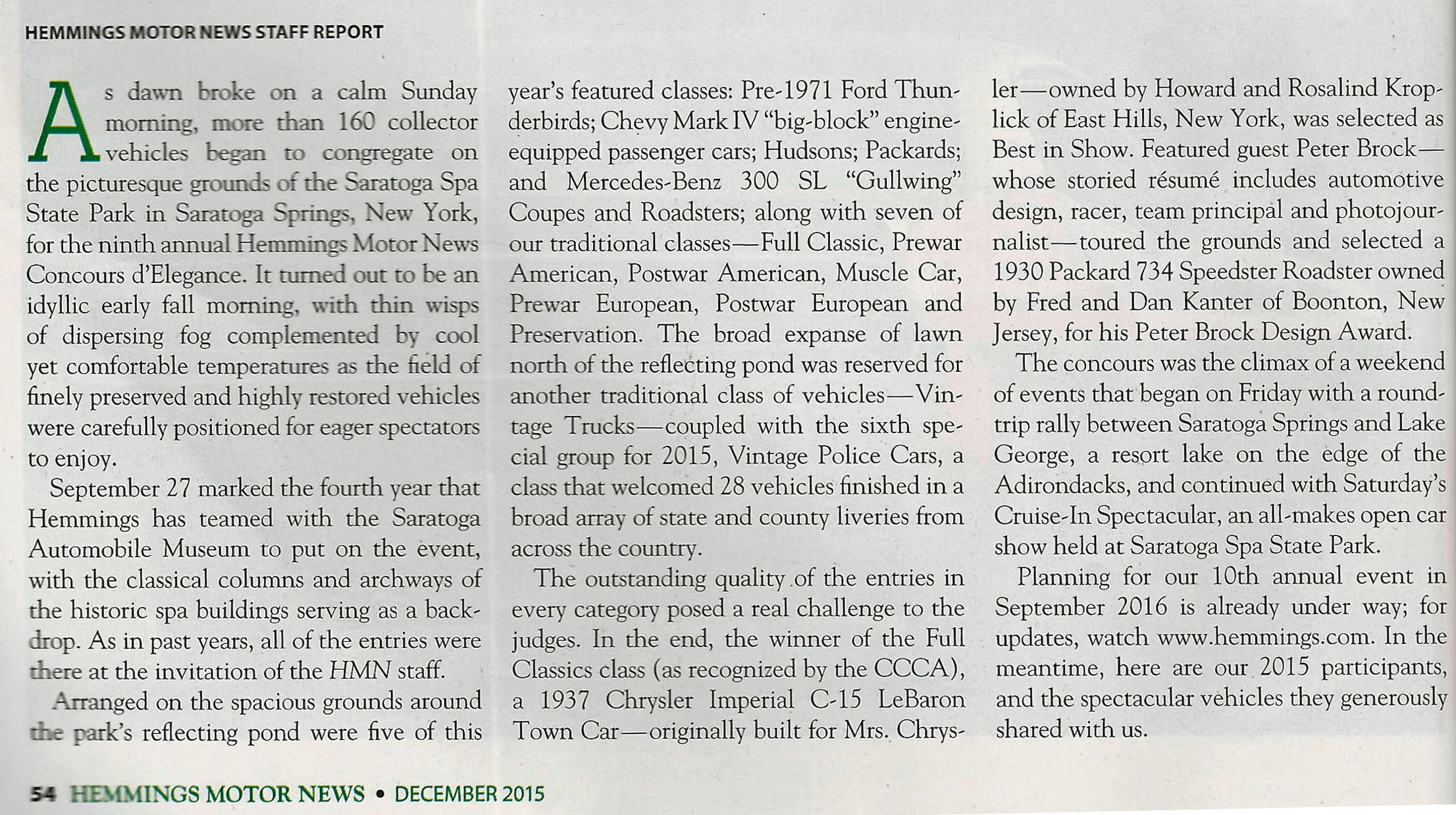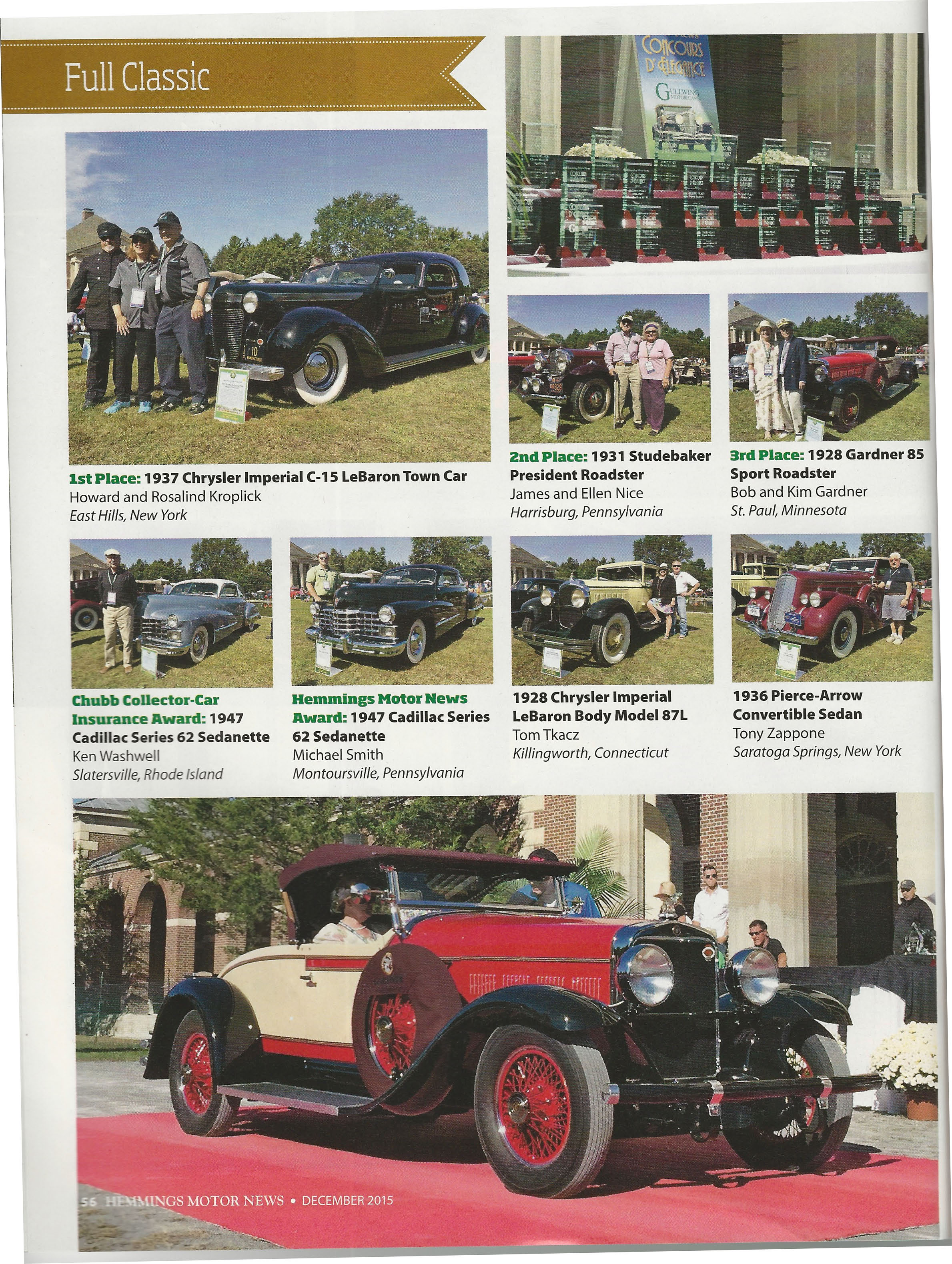 The December 2015 issue of the Hemmings Motor News features all the entrants to the 9th Annual Hemmings Concours d'Elegance held on September 27, 2015. The 1937 Chrysler's Chrysler is highlighted on the cover as Best in Show.