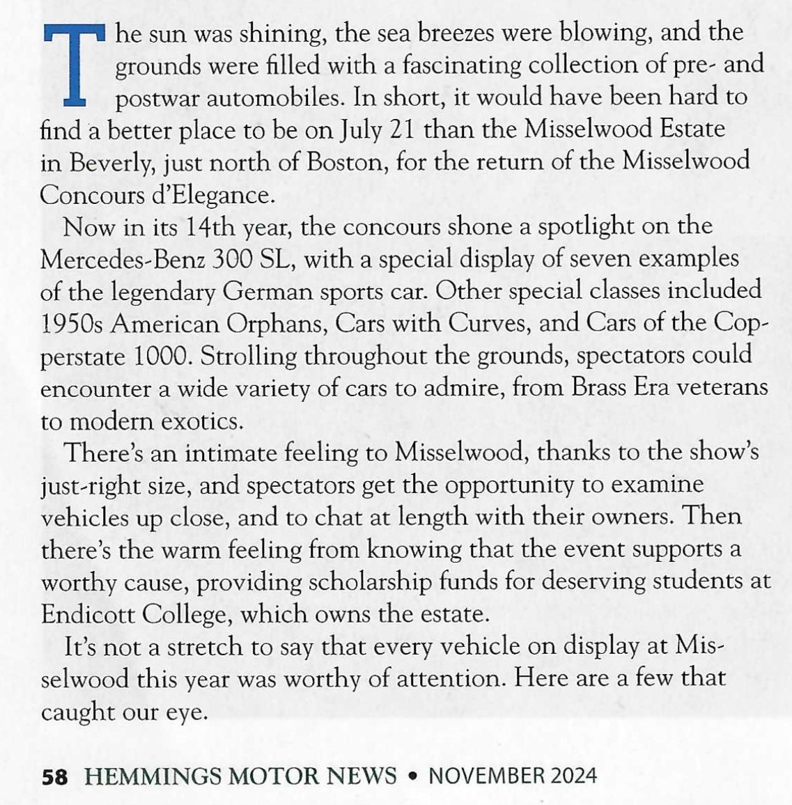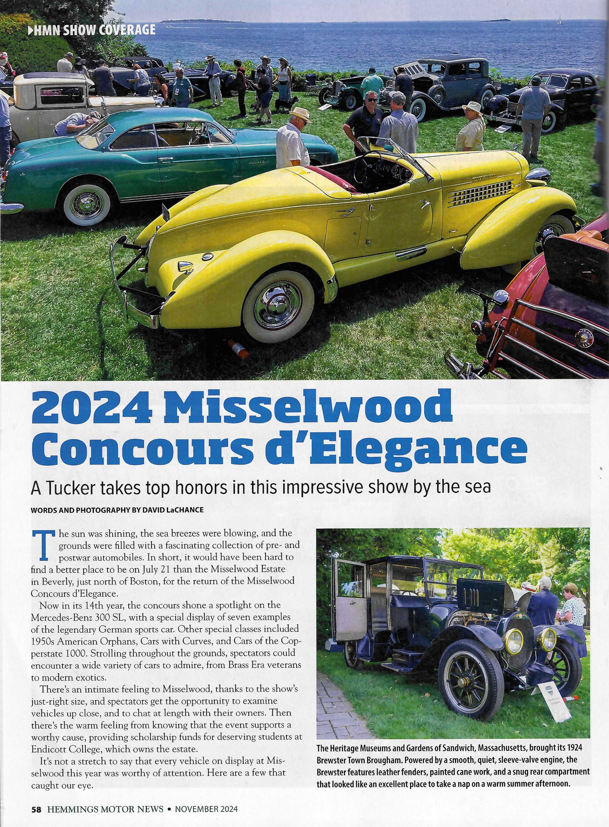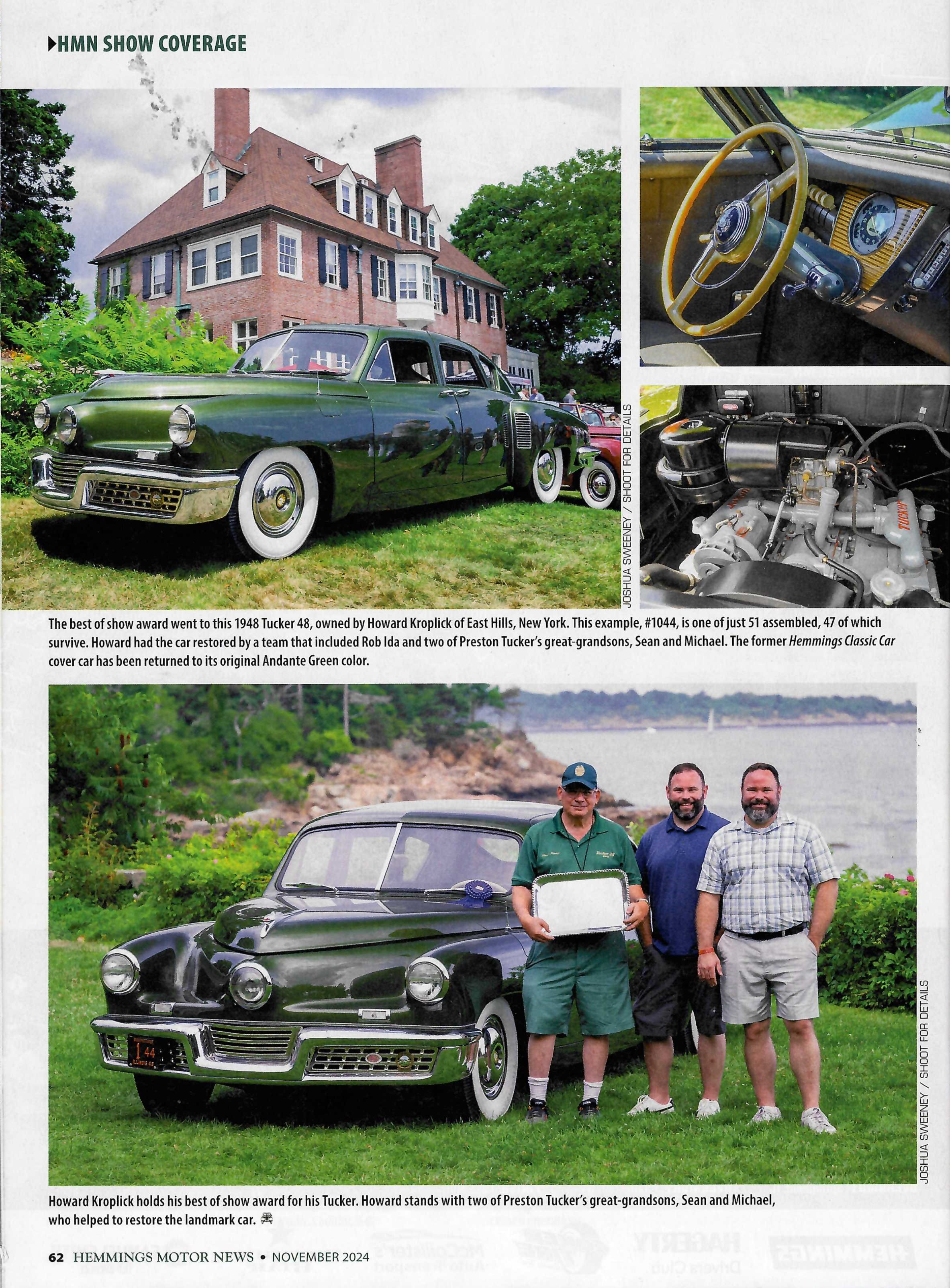 The November 2024 issue of Hemmings Motor News reports on the The Misselwood Concours d'Elegance where Tucker 1044 was awarded "Best in Show."
