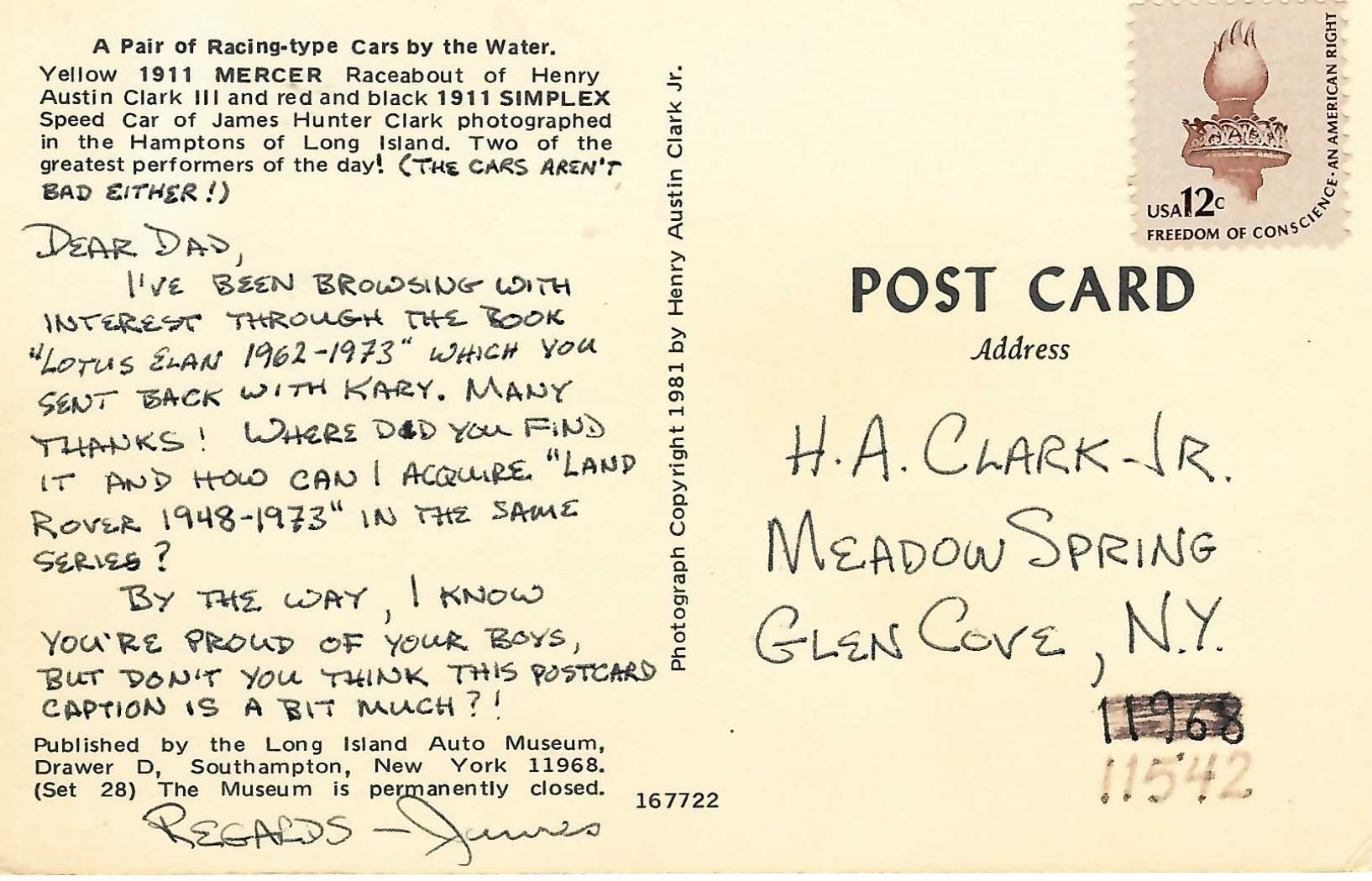 Another museum card, this time Henry Austin Clark's Mercer is paired up with his son, James Hunter Clark's 1911 Simplex in the Hamptons.