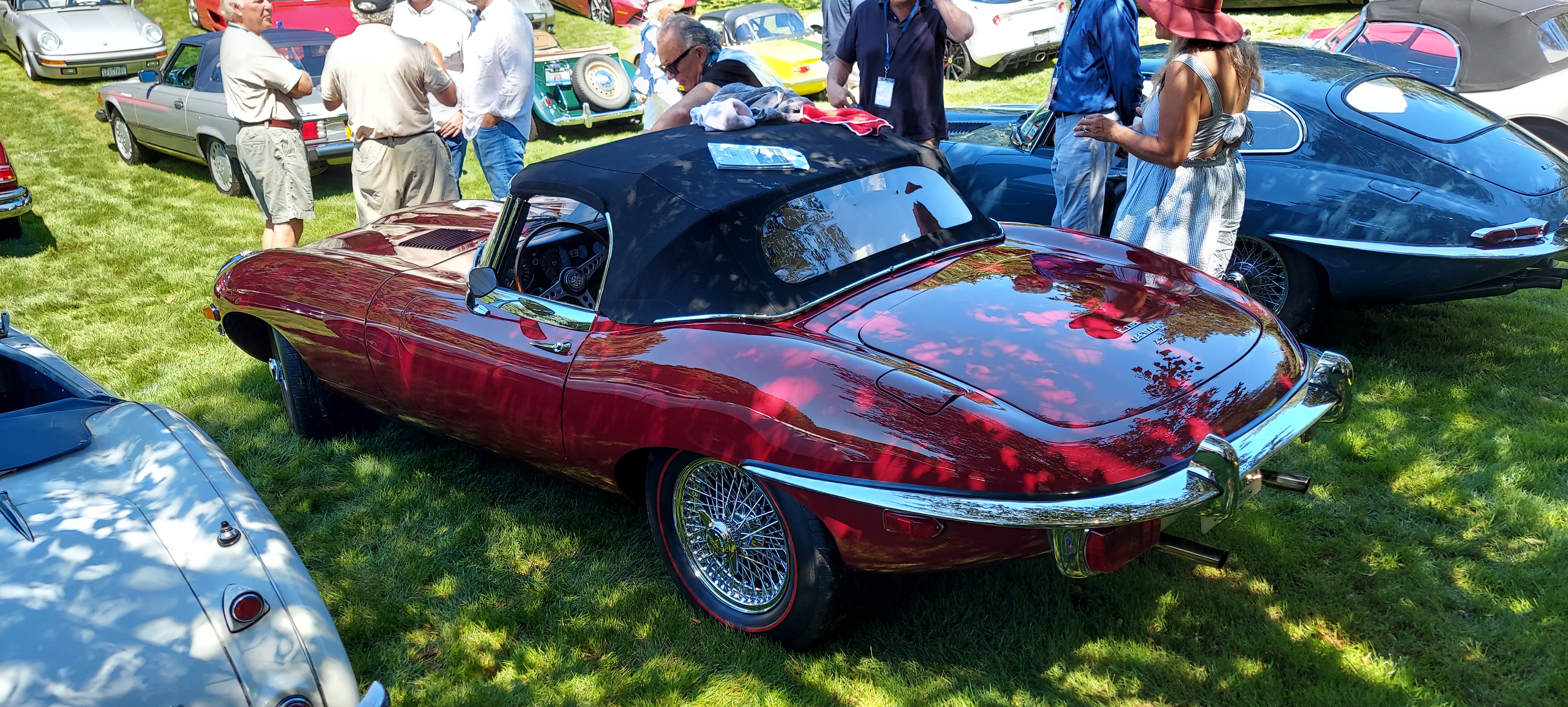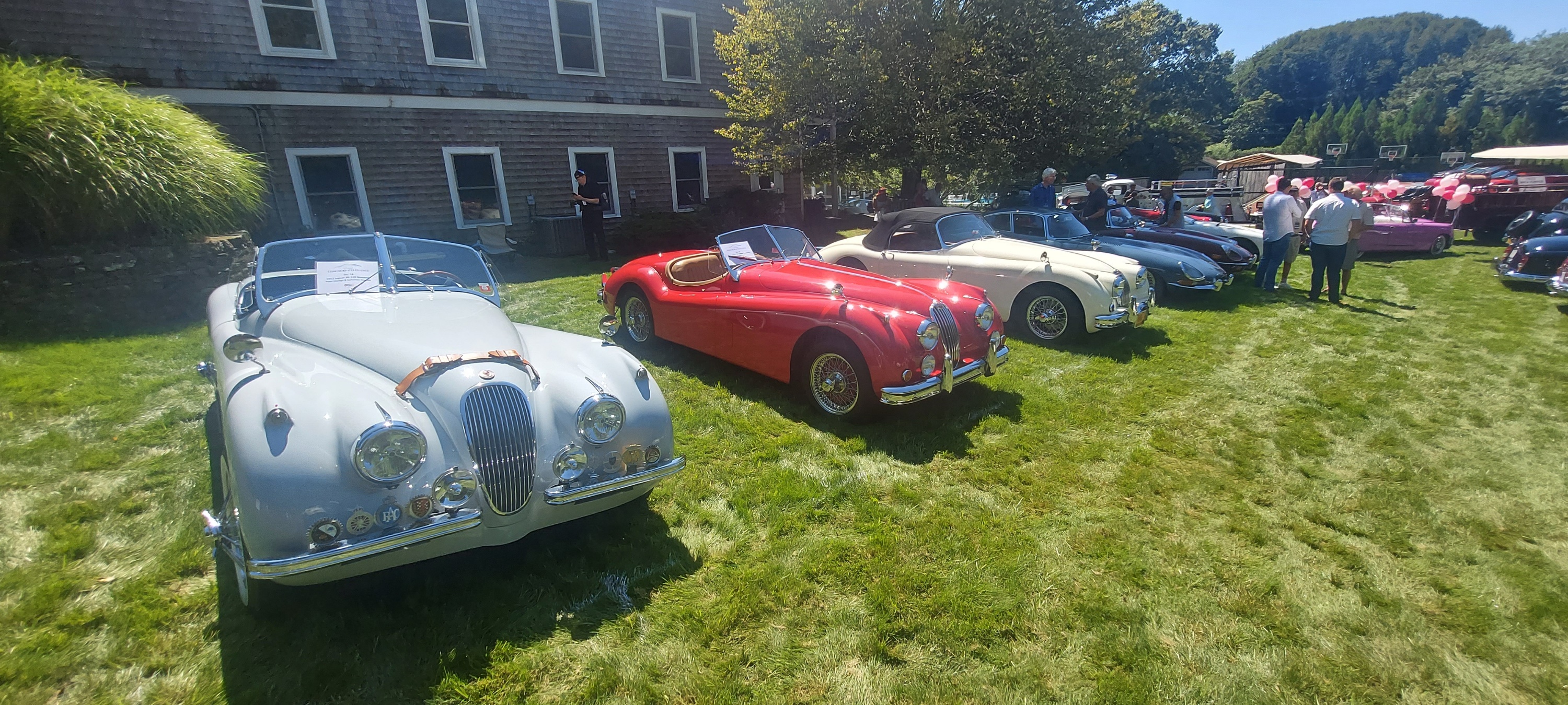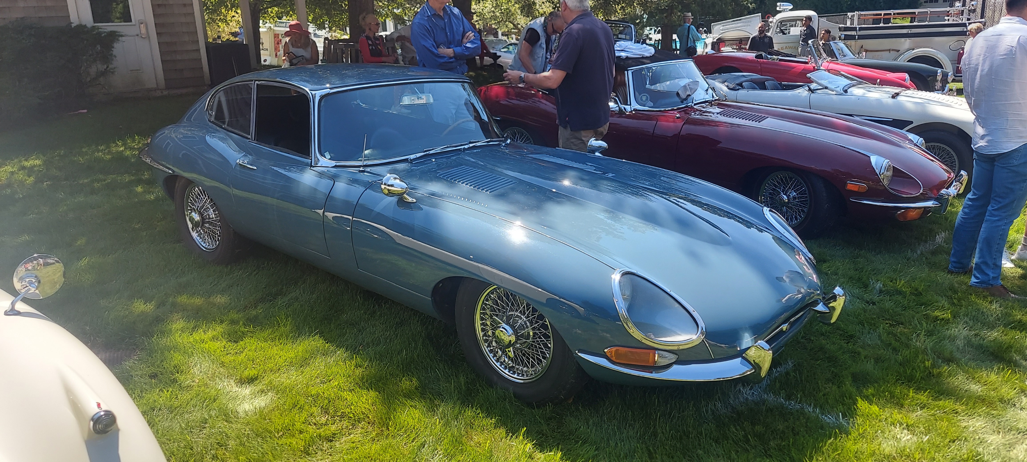 Here, a row of fine Jaguars starting L to R with a 1952 XK-120, '56 XK-140MC, '59 XK-150S, '63 Series 1 XKE and a '69 XKE Series II off at the end.