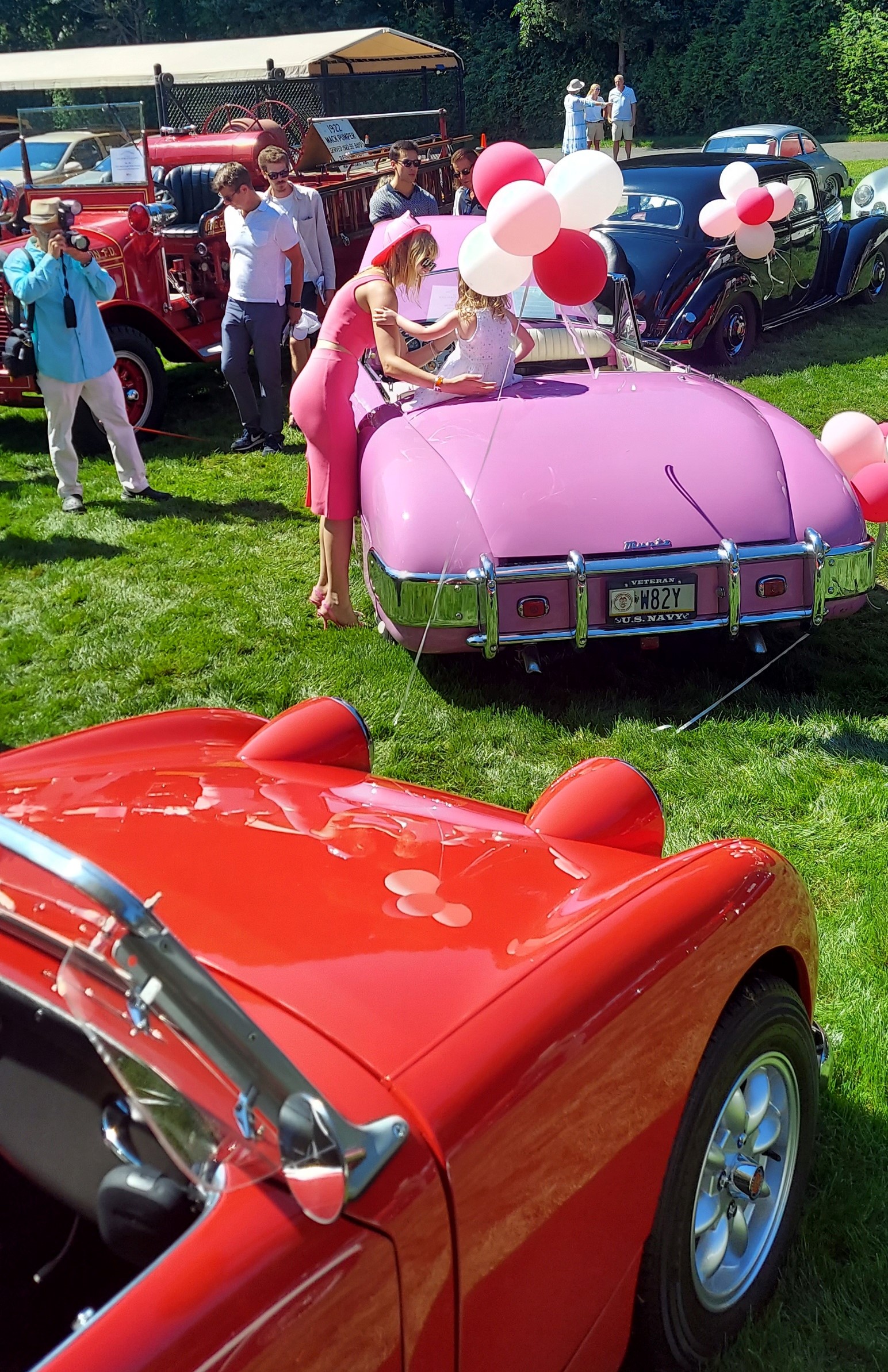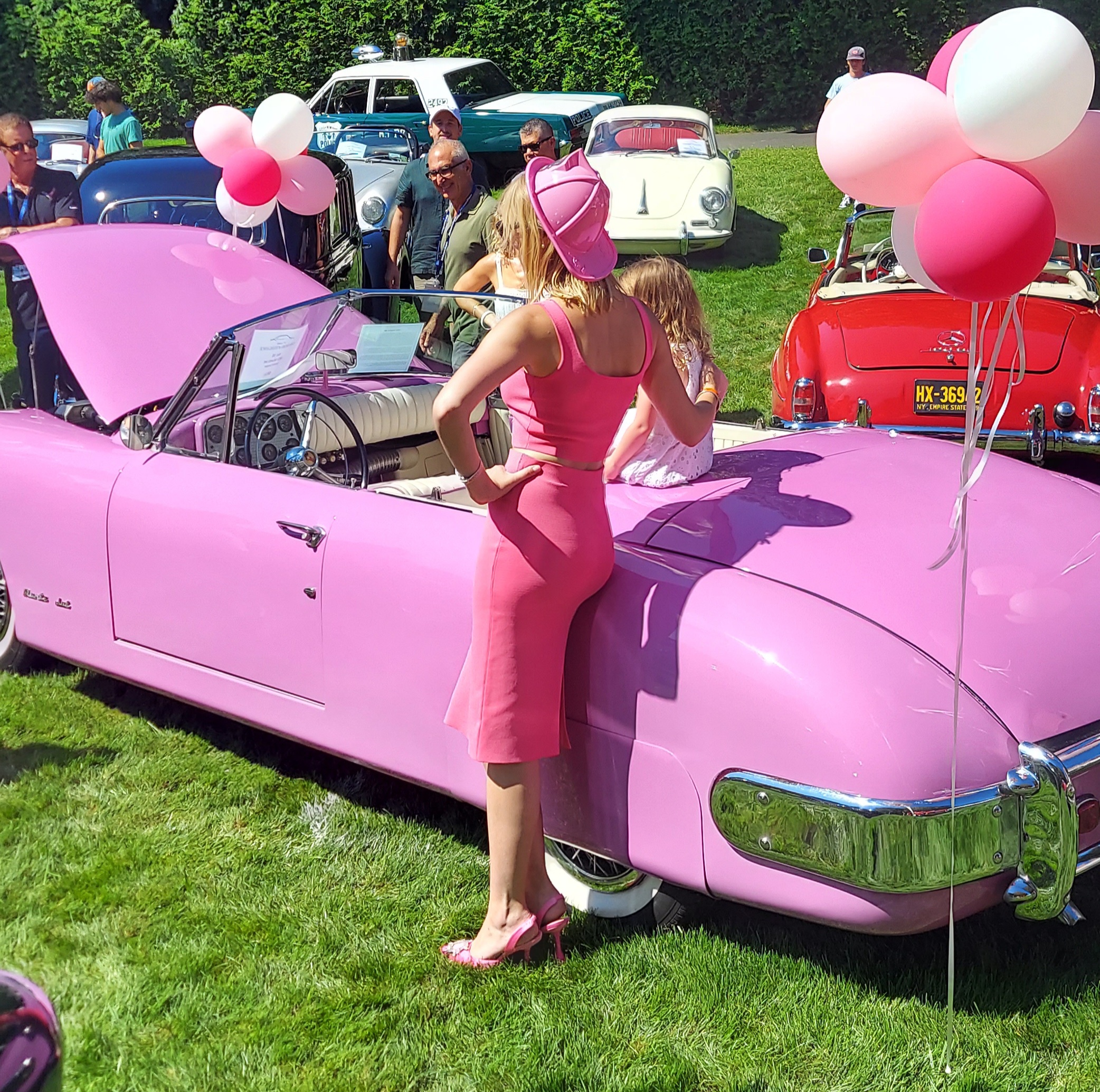 The Sprite watching Barbie give all kiddies photo ops in her bright pink, 1952 Muntz Jet (owned by David Cooper)